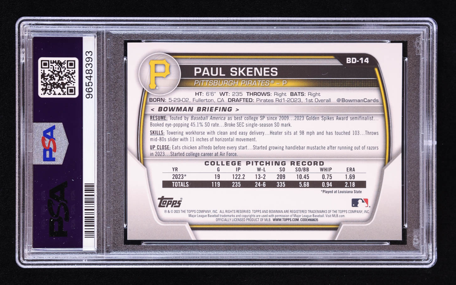 Paul Skenes 2023 Bowman Draft #BD14 RC (PSA 10)