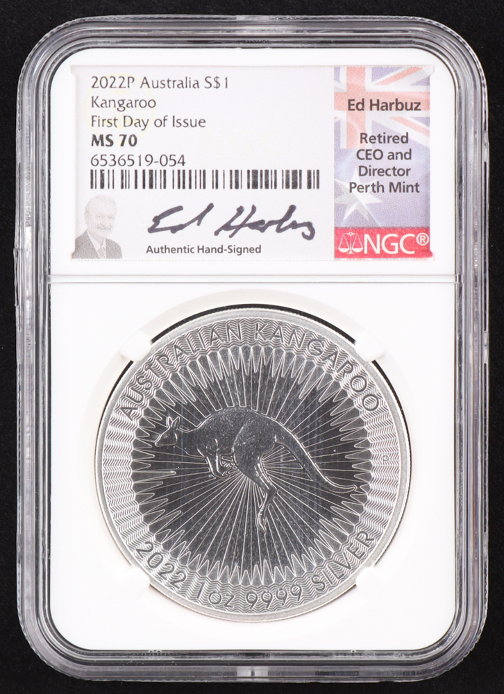 2022 Australia $1 Kangaroo, First Day Issue - 1 Ounce .9999 Silver - Hand Signed By Ed Harbuz (NCG MS70)
