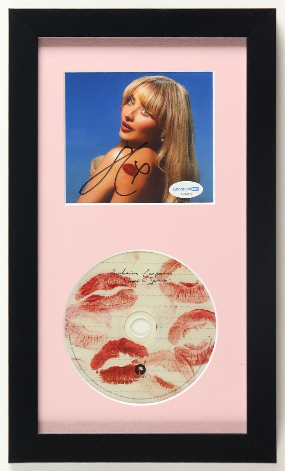 Custom frame measures approximately 8" x 13.5" in size. Features a "Short N' Sweet" CD insert that has been hand-signed by Sabrina Carpenter. The display also includes the disc as shown.