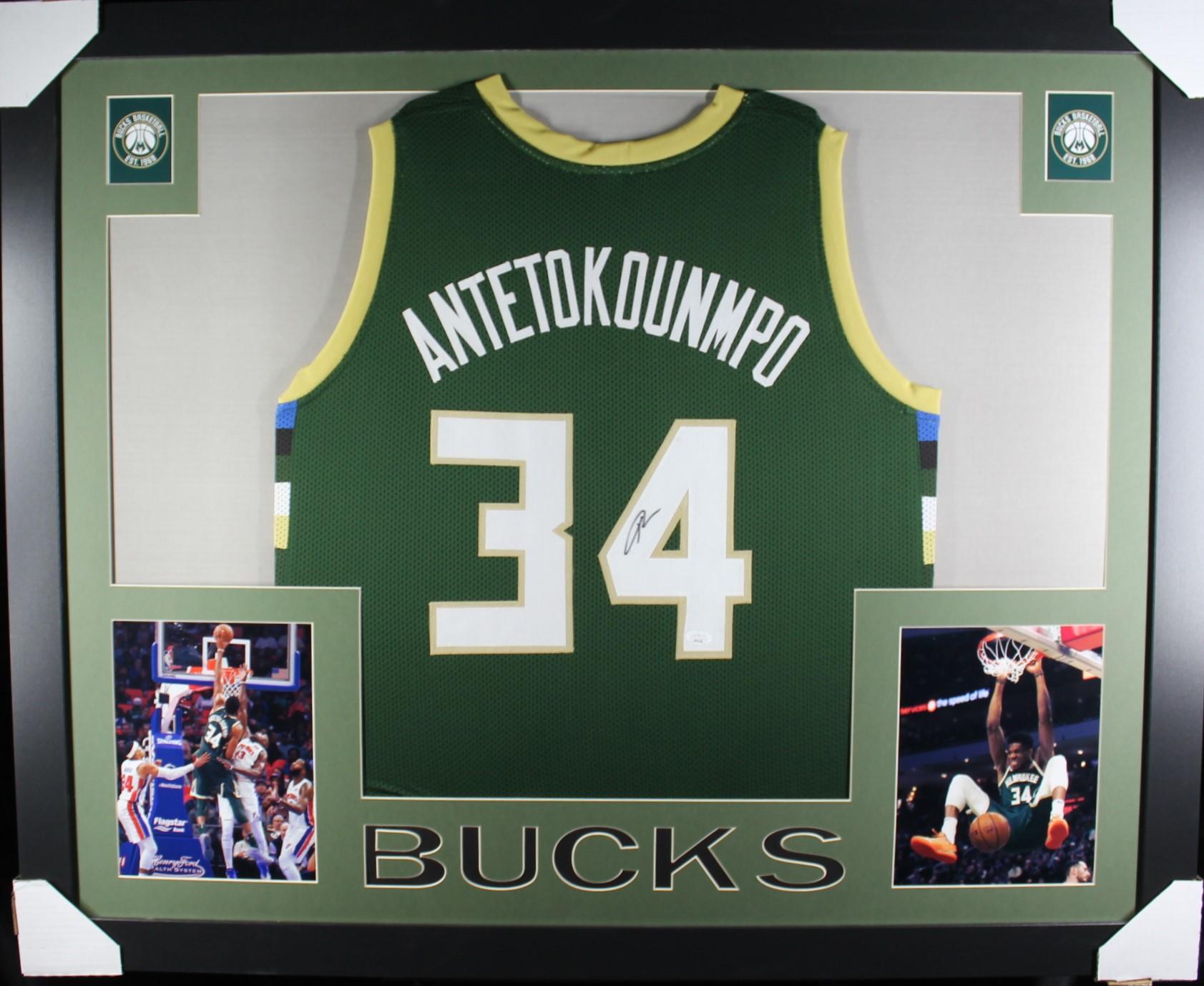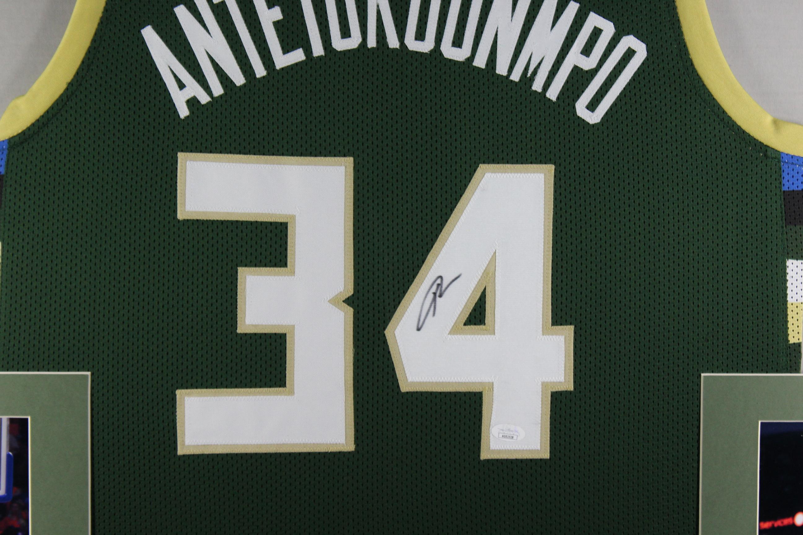 Custom frame measures approximately 35" x 43" in size and features a jersey that has been hand-signed by Giannis Antetokounmpo.