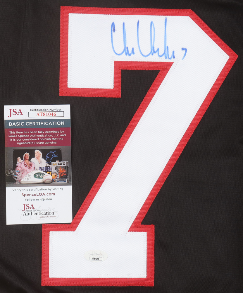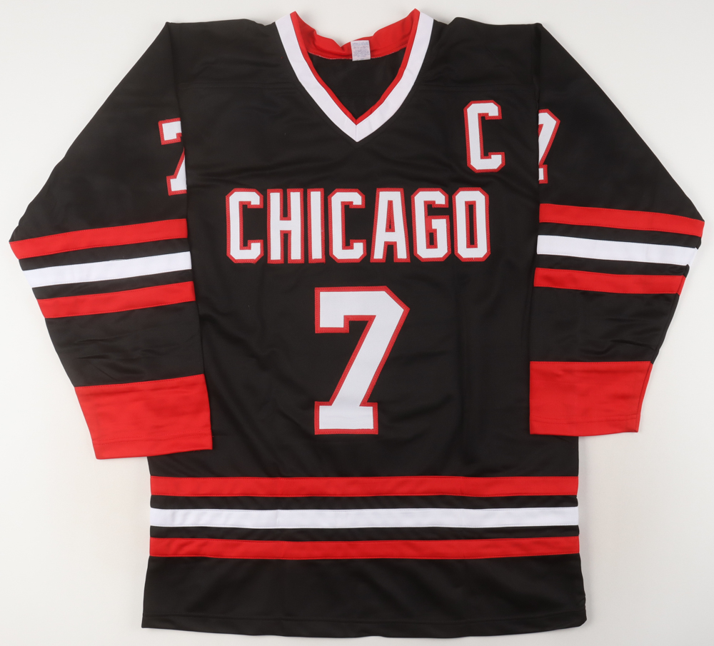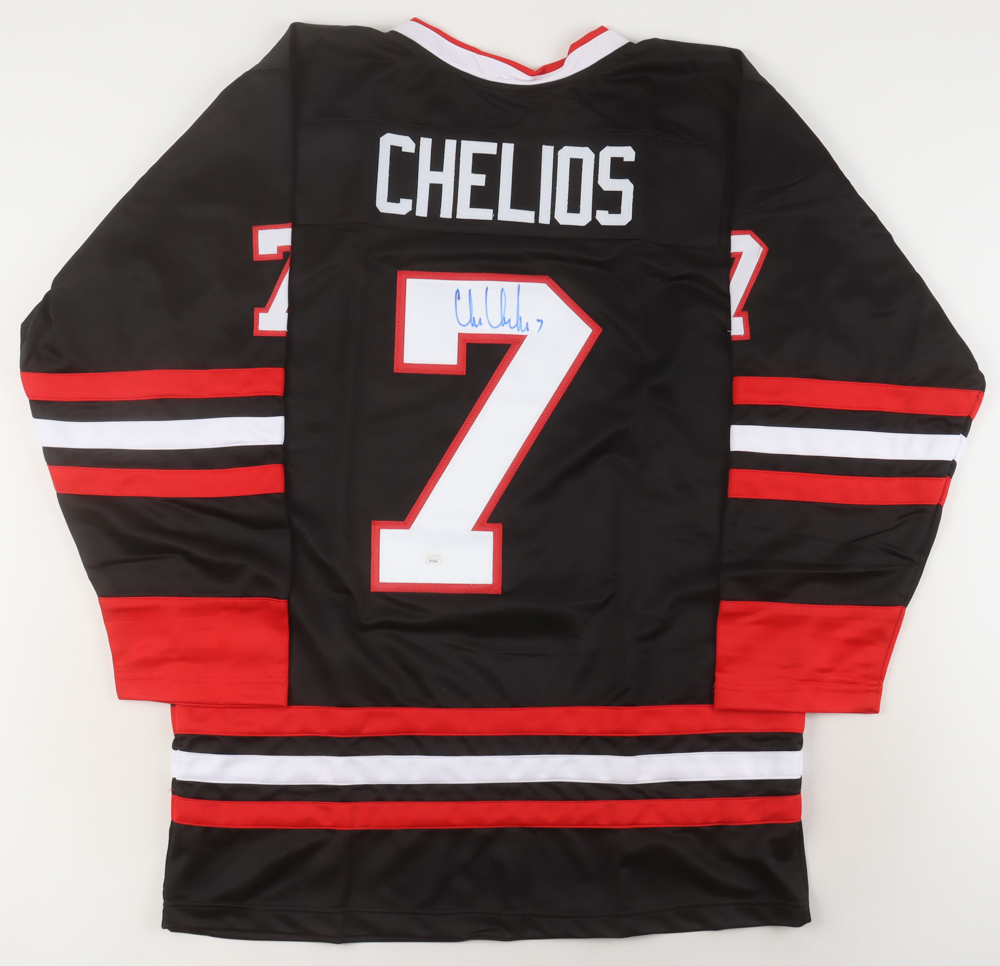 Custom jersey with everything sewn on, size XL. Hand-signed by Chris Chelios (HOF).
