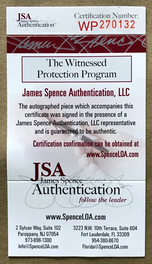 The lot / autograph(s) includes an official James Spence Authentication (JSA) hologram and matching COA for authenticity purposes. The signing of this item was witnessed by JSA.