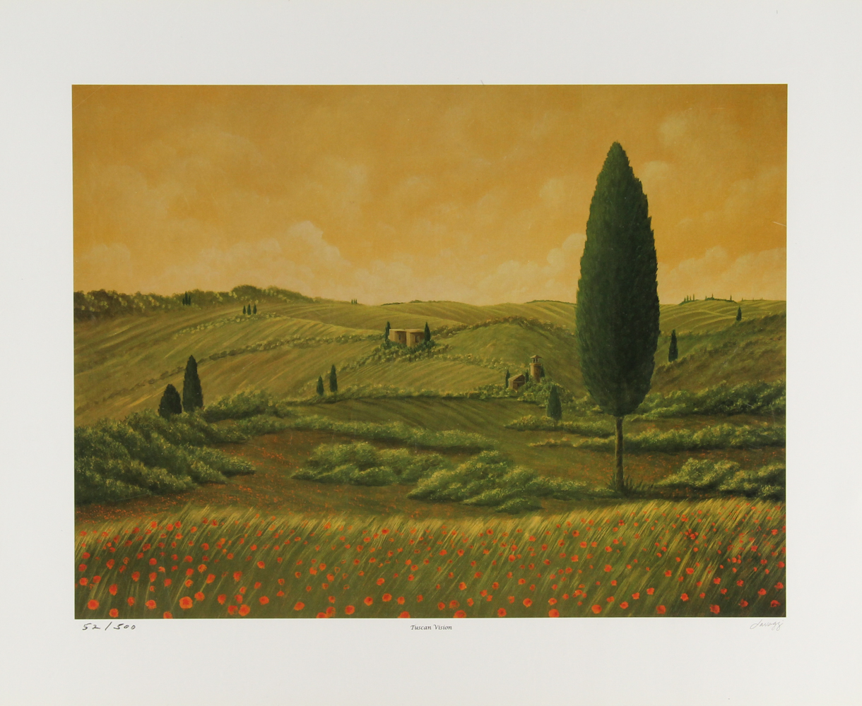 "Tuscan Vision" is a limited edition lithograph on paper by Steven Lavaggi, hand signed and numbered by the artist! Measures approx. 20" x 16" (with border); 16" x 12" (image).