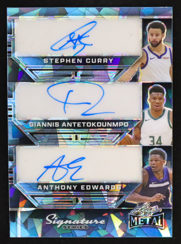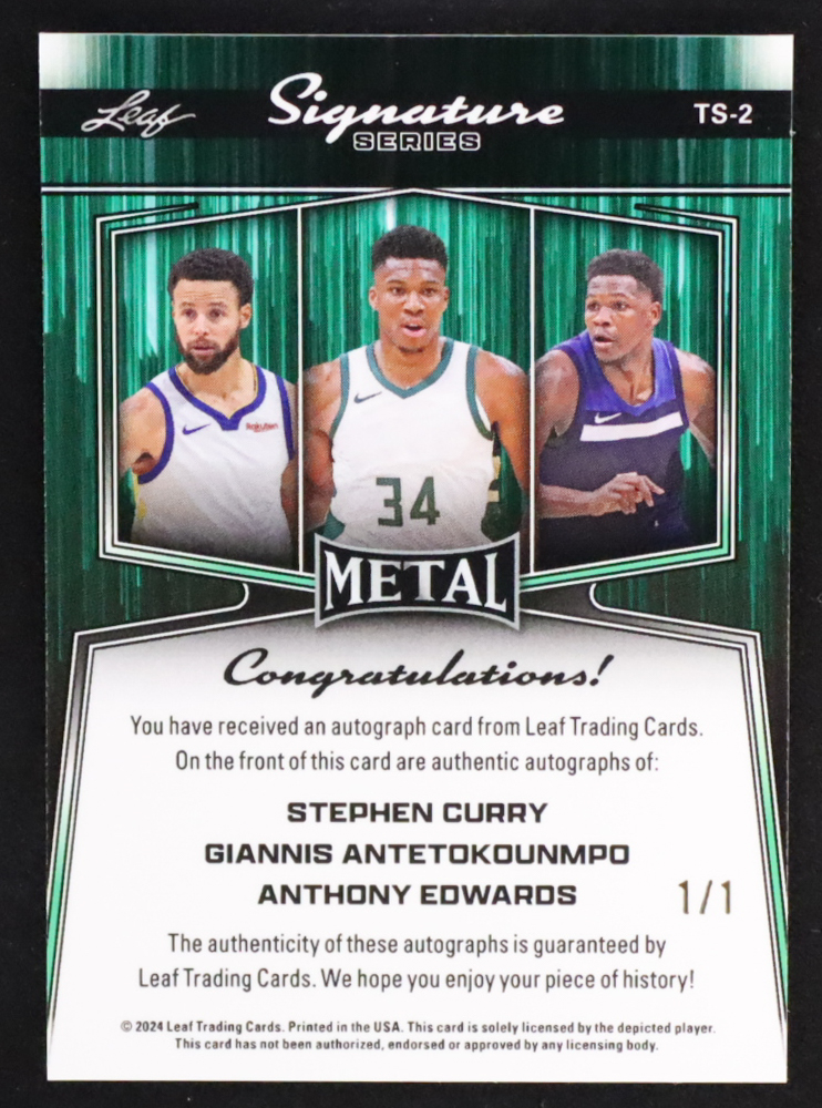 Stephen Curry / Giannis Antetokounmpo / Anthony Edwards 2024 Leaf Metal Signature Series Crystal Platinum #TS2 #1/1