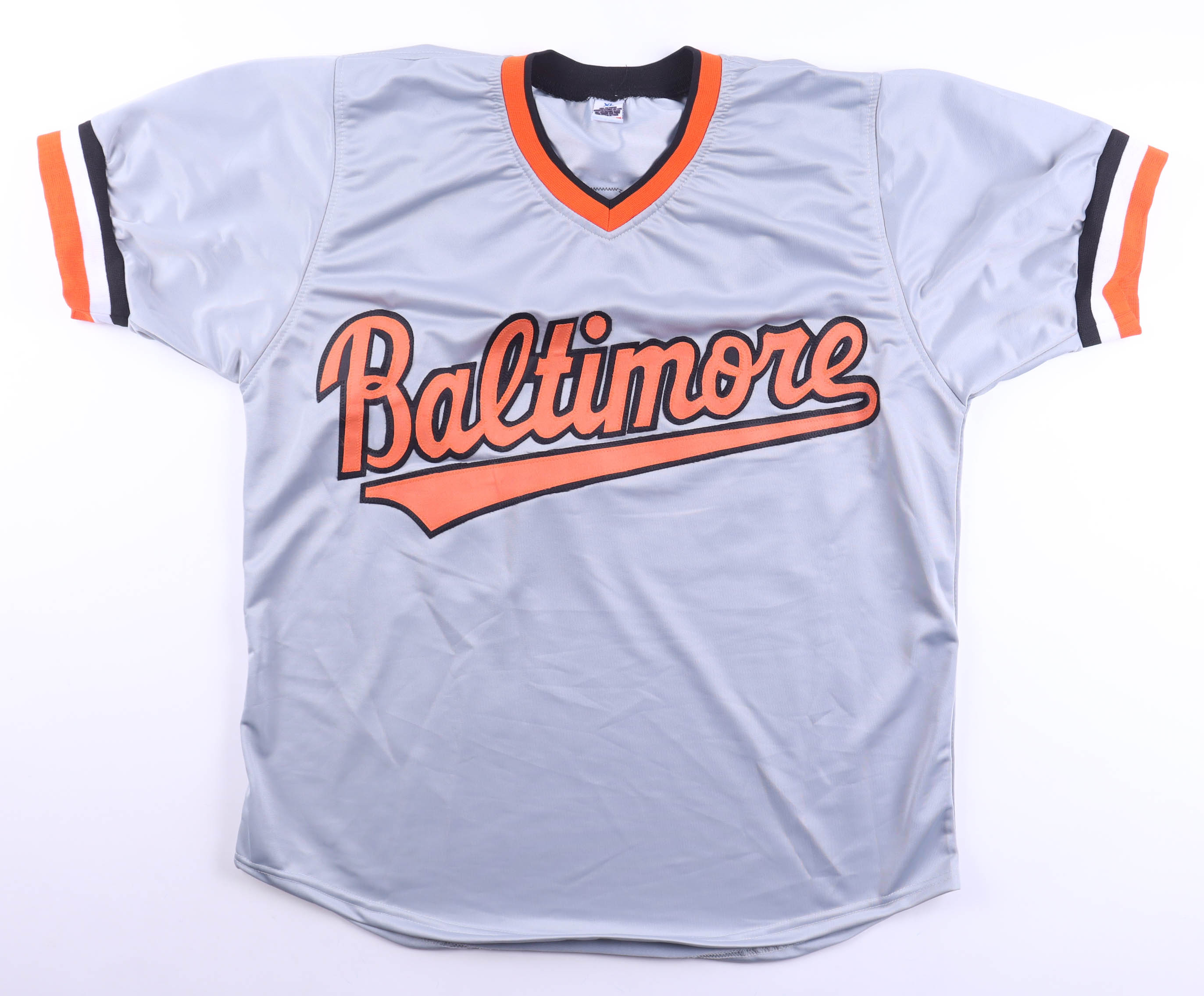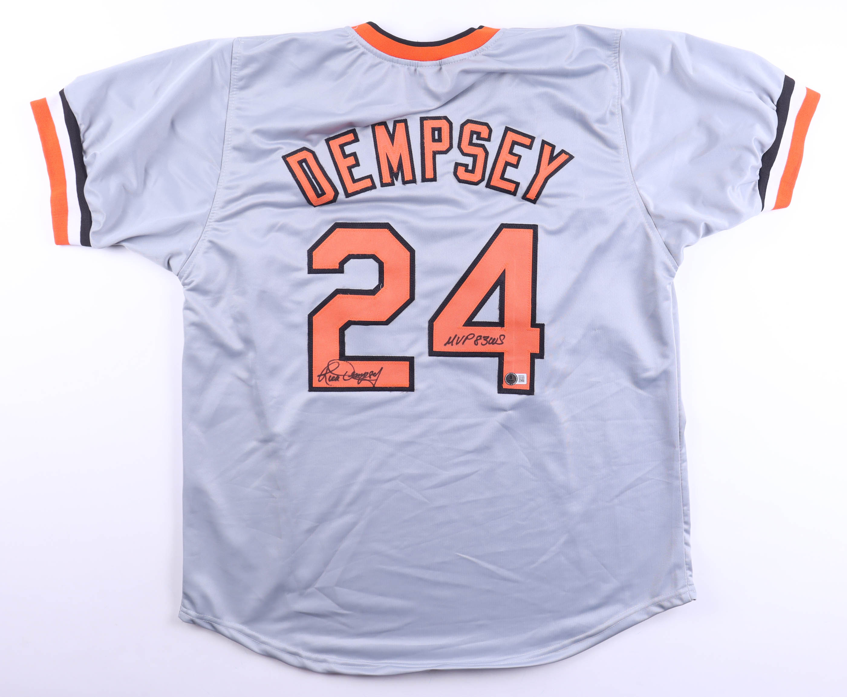 Custom jersey, everything is sewn on, size XL. Hand-signed and inscribed by Rick Dempsey. Please note, the signature and inscription has bled.