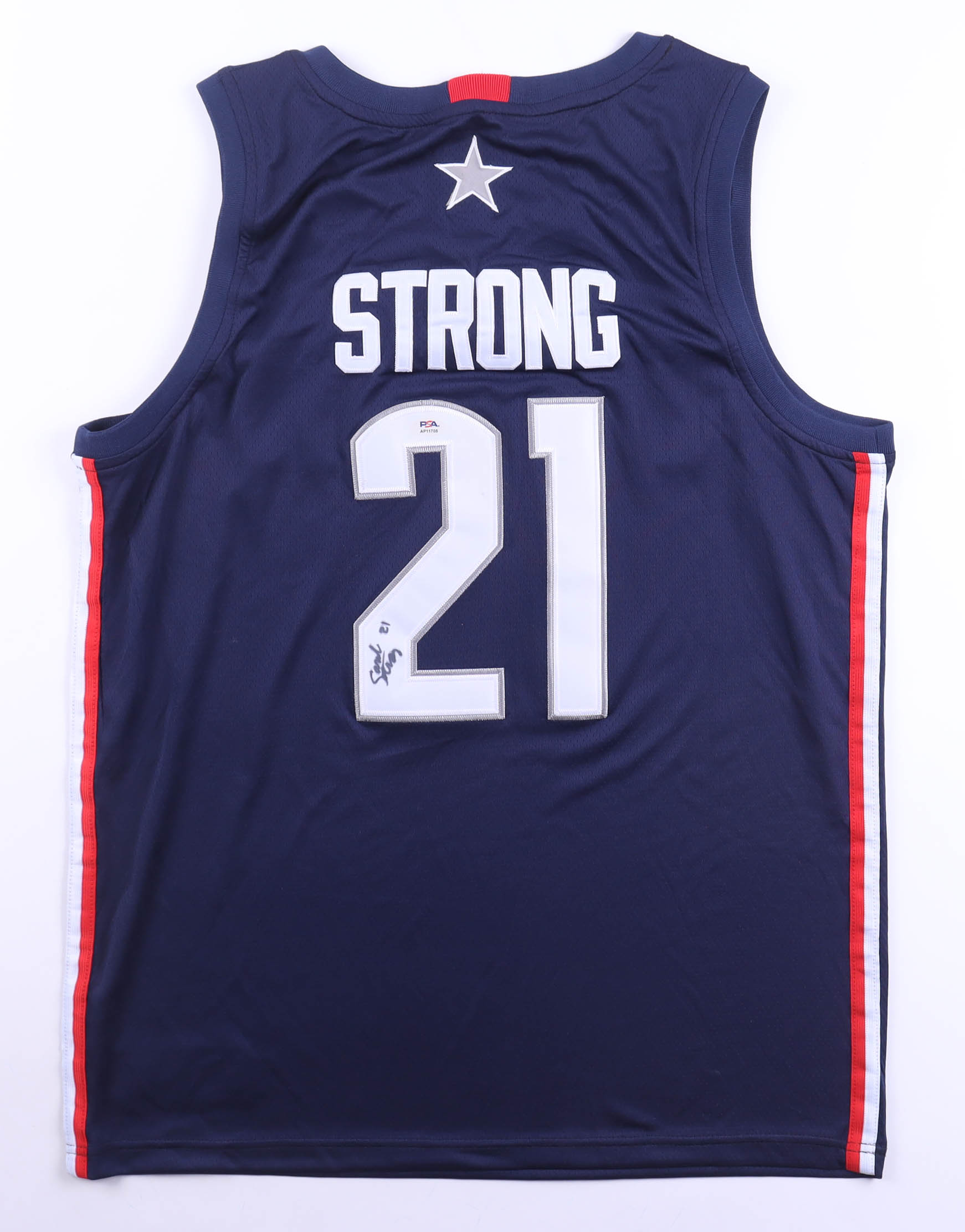 Nike jersey with everything sewn on, size L. Hand-signed by Sarah Strong. Please note, there is a stain on the reverse number and the signature has bled. See photos regarding the condition of the item.