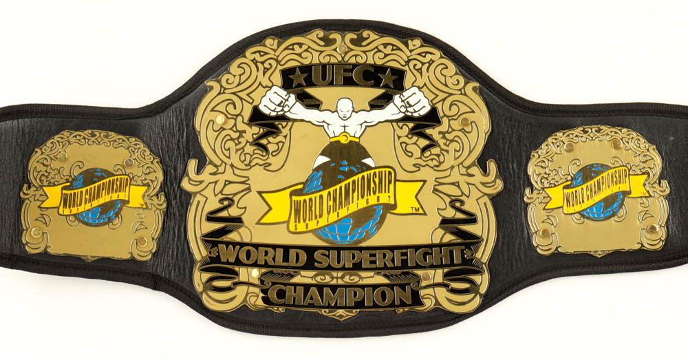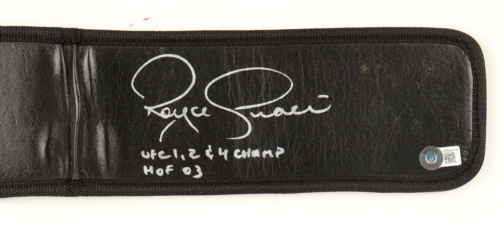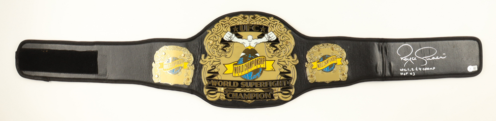Replica full-size UFC championship belt has been hand-signed and inscribed by Royce Gracie (HOF).