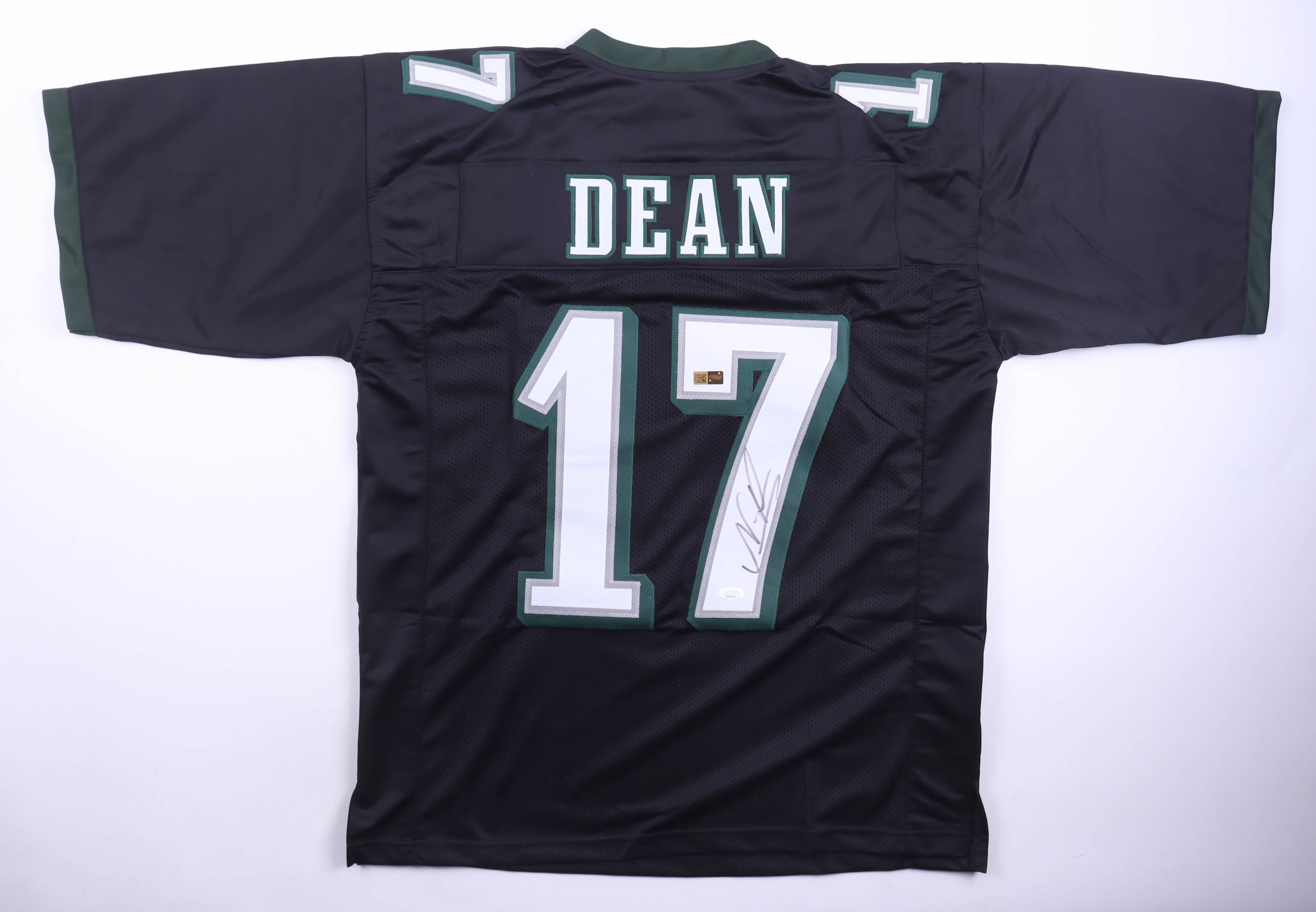 Custom on-field style jersey. Everything sewn on, size XL. Hand-signed by Nakobe Dean.