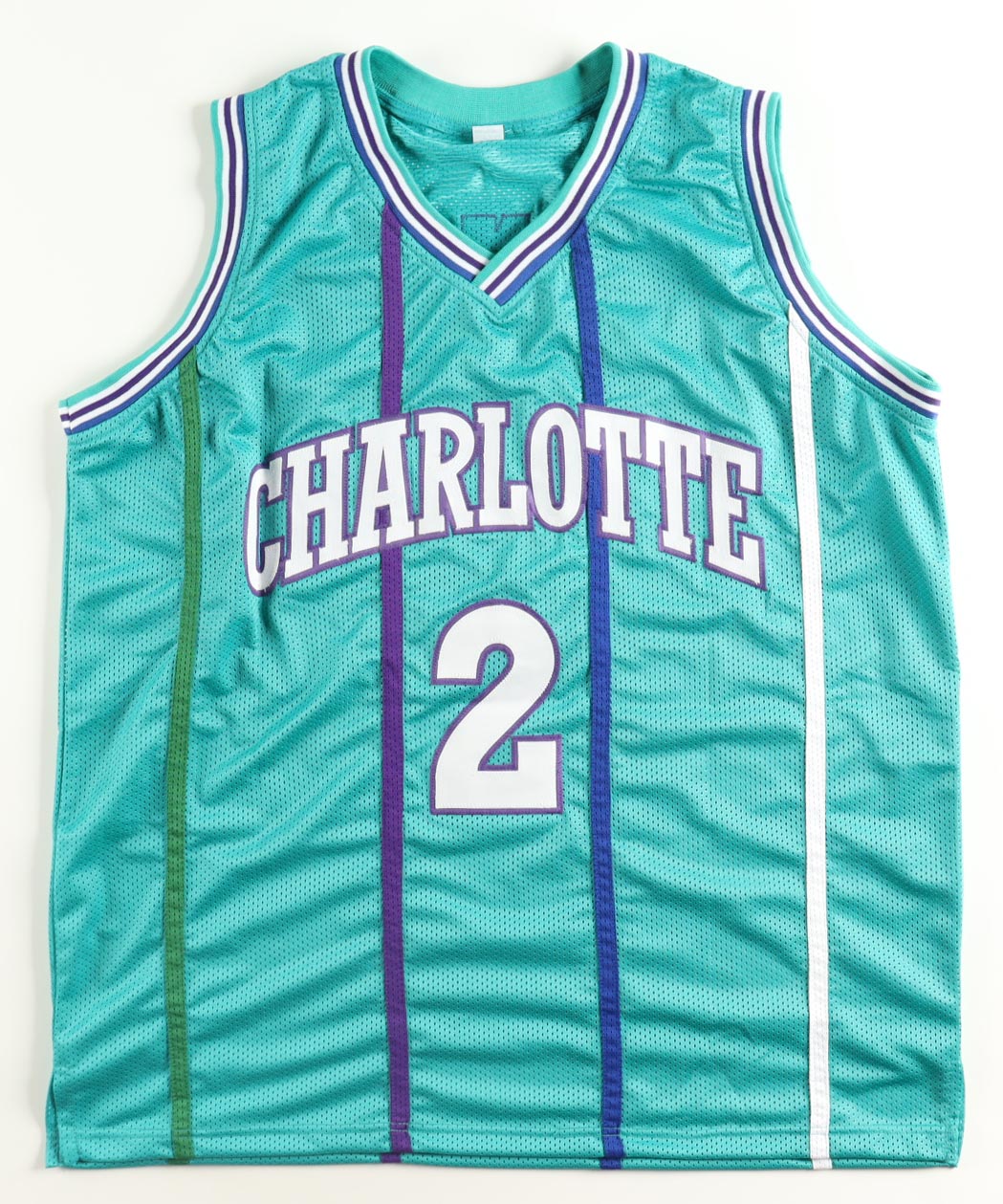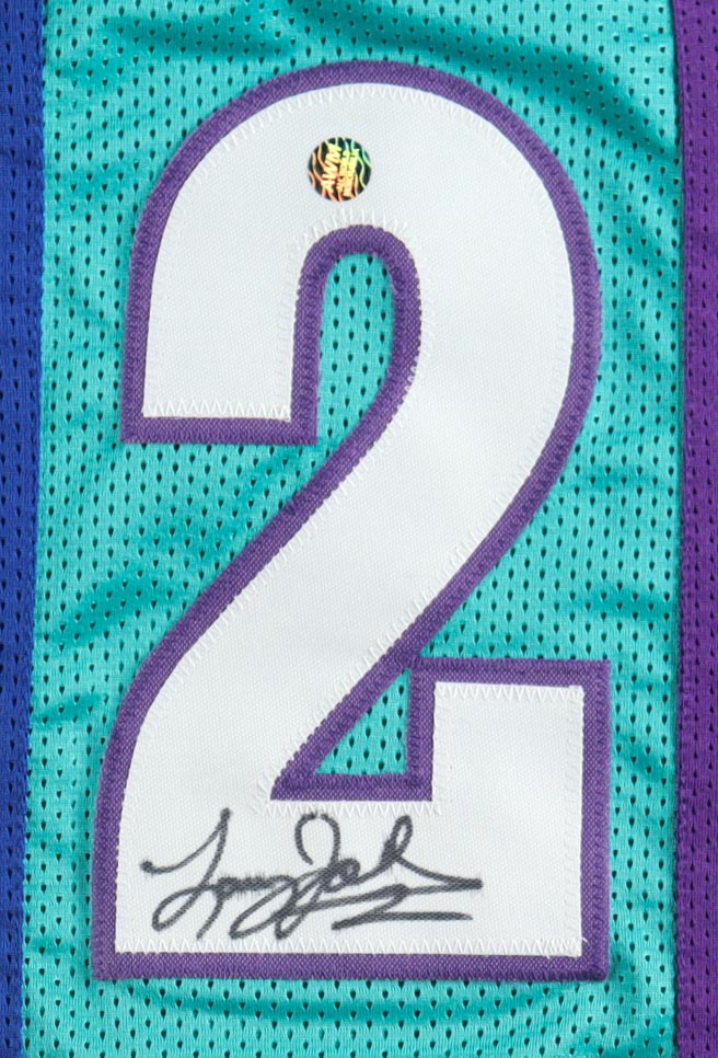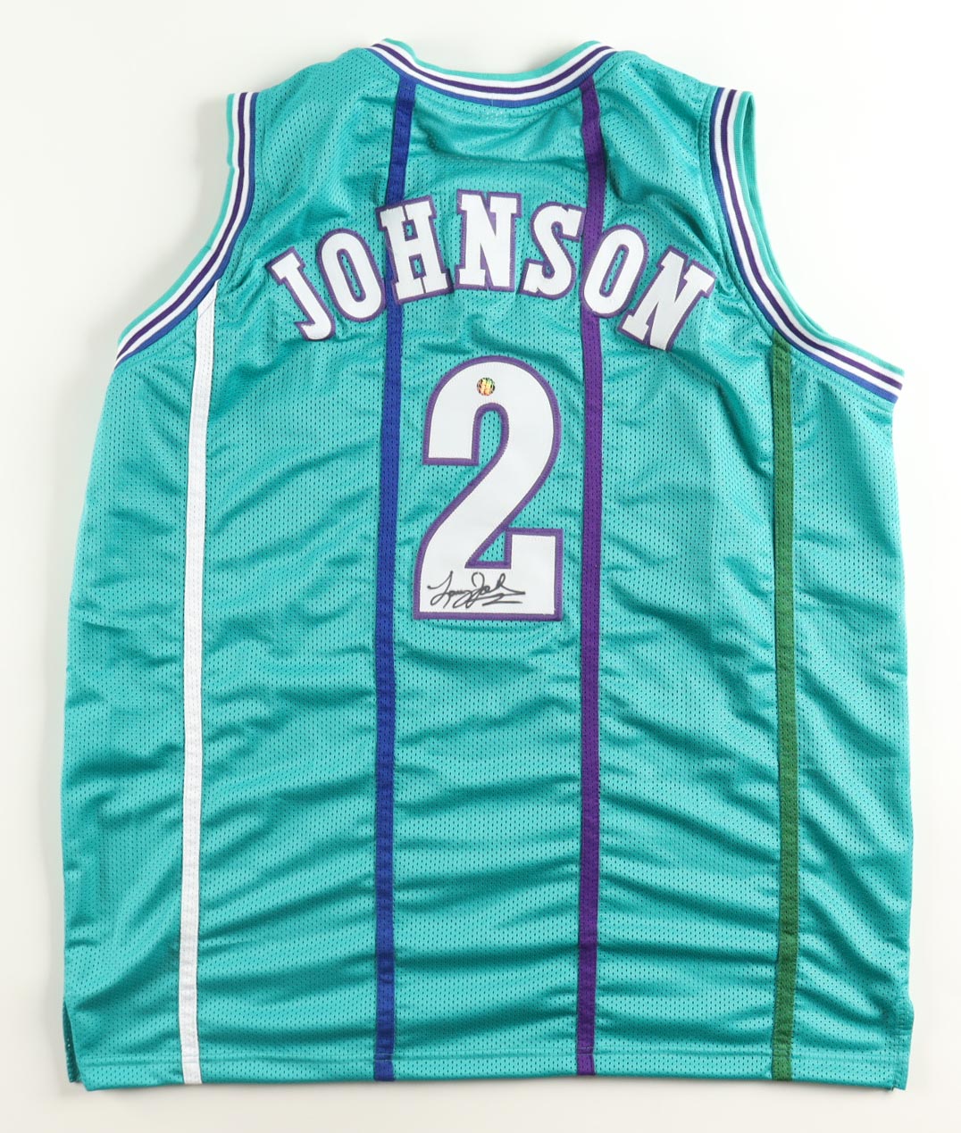 Custom jersey with everything sewn on, size XL. Hand-signed by Larry Johnson. Please note, the signature ink has bled.