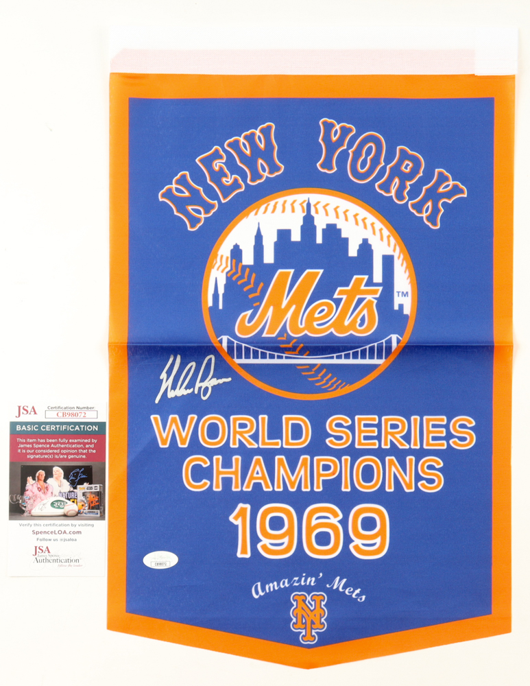 New York Mets 1969 World Series champions cloth banner, measures approximately 12" x 18" in dimension. Hand-signed by Nolan Ryan (HOF).