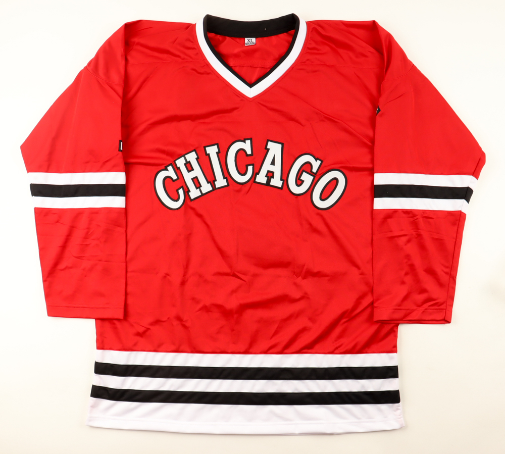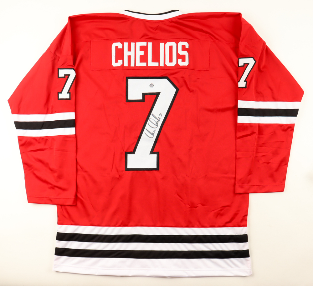 Custom jersey with everything sewn on, size XL. Hand-signed by Chris Chelios (HOF).
