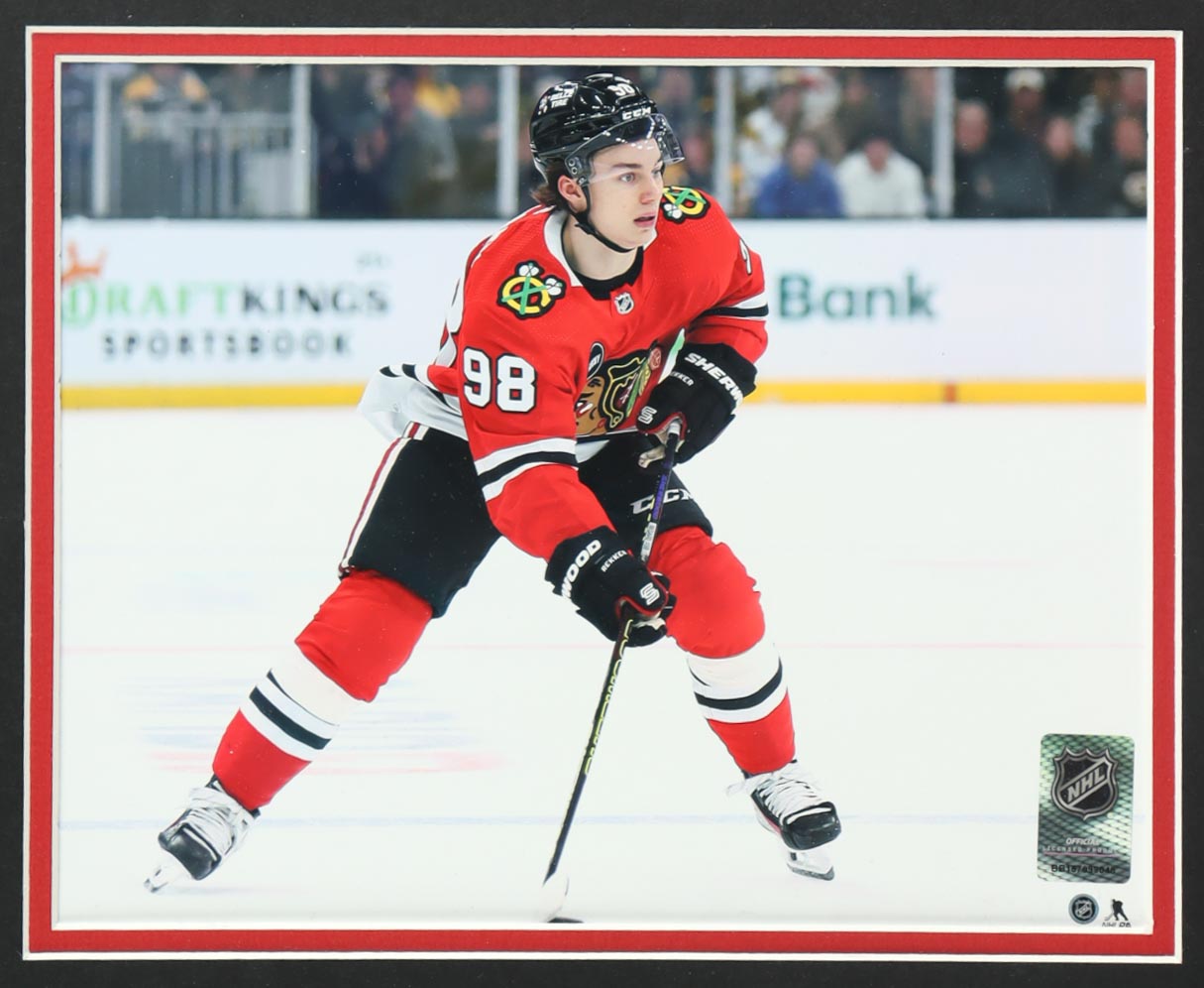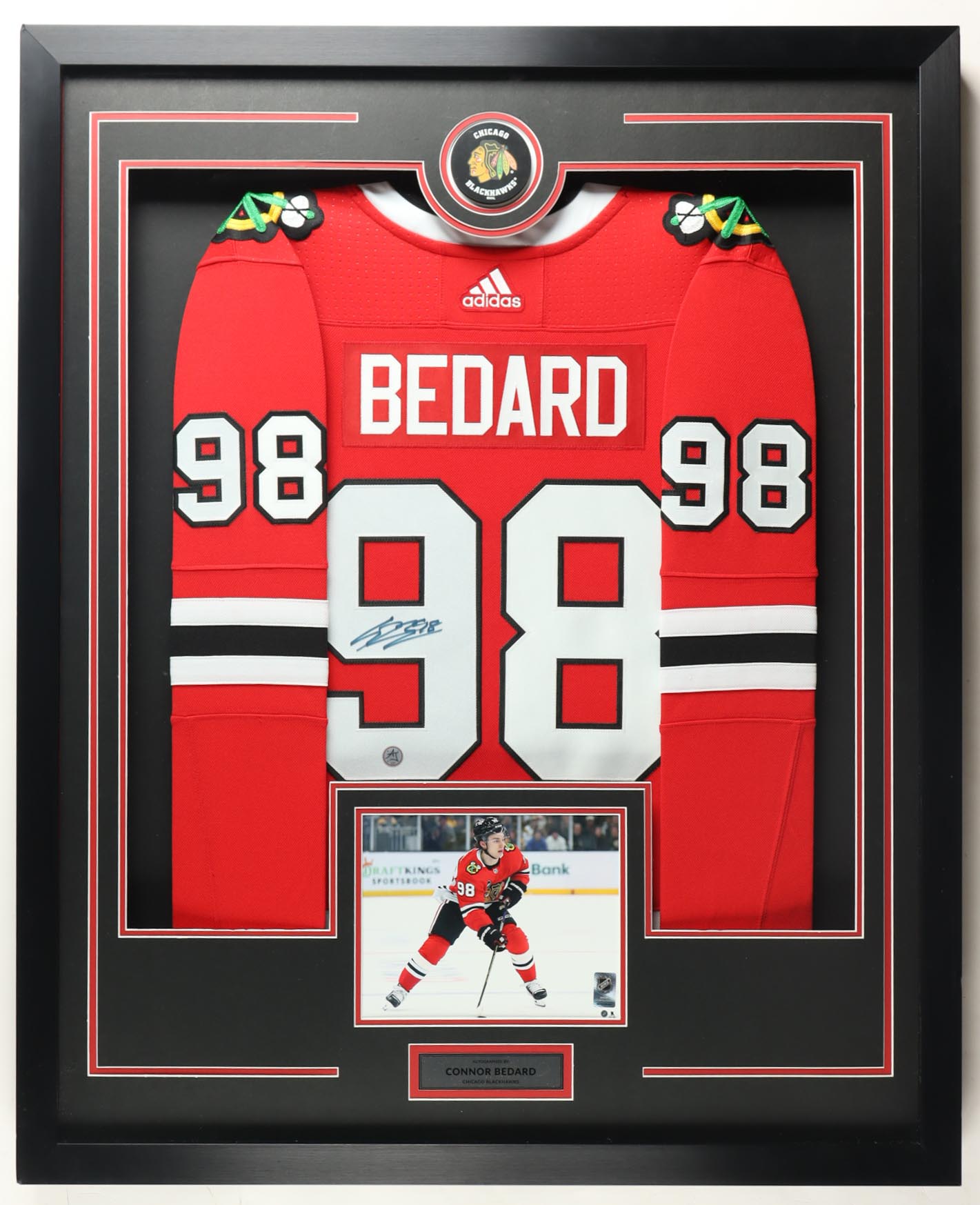 Custom frame measures approximately 34.5" x 43.5" in size and features an Adidas jersey that has been hand-signed by Connor Bedard (Chicago Blackhawks).