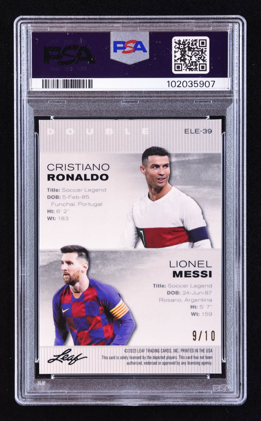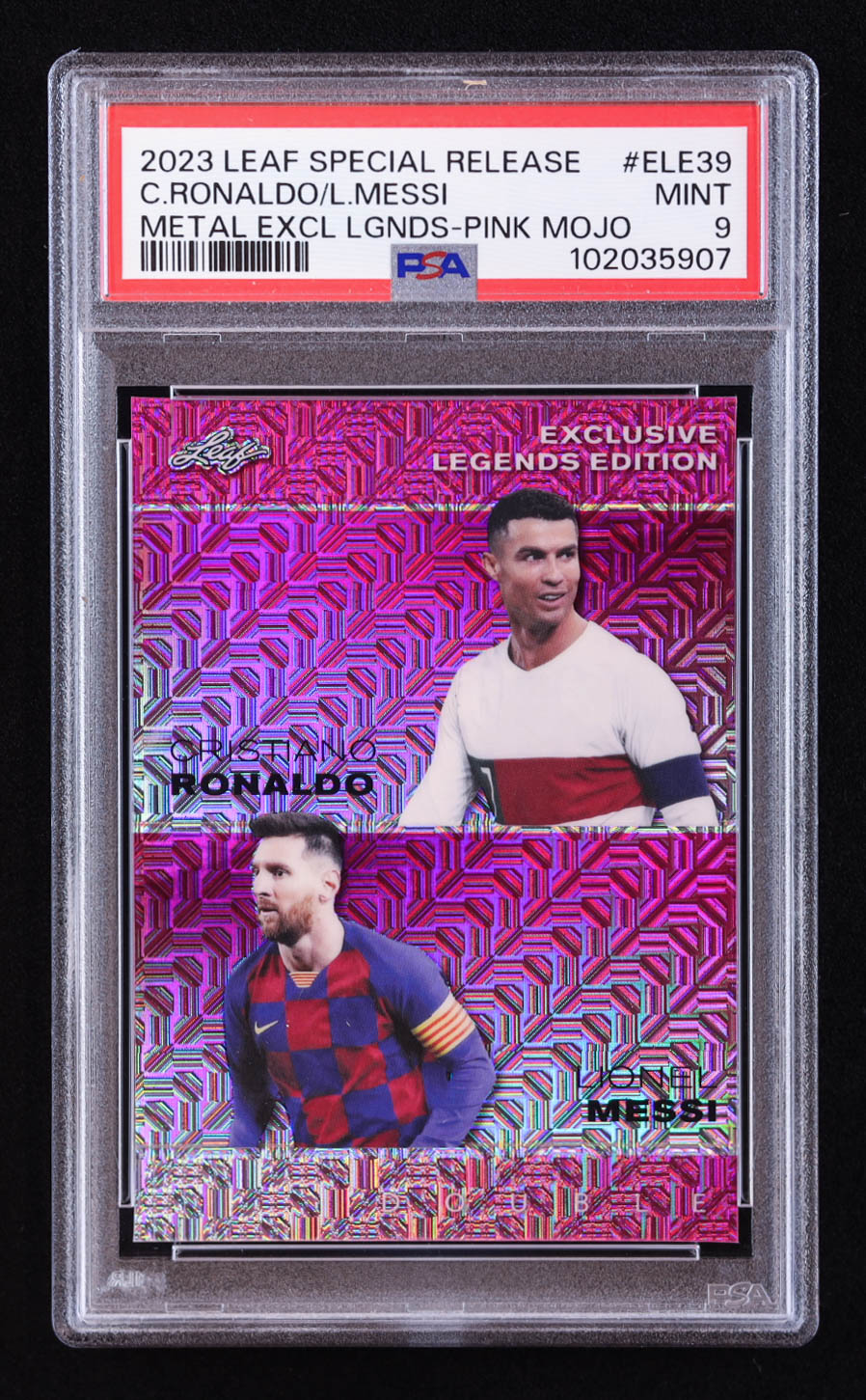 Cristiano Ronaldo / Lionel Messi 2023 Leaf Metal Special Release Exclusive Legends Edition Mojo Pink #ELE39 #9/10 (PSA 9)