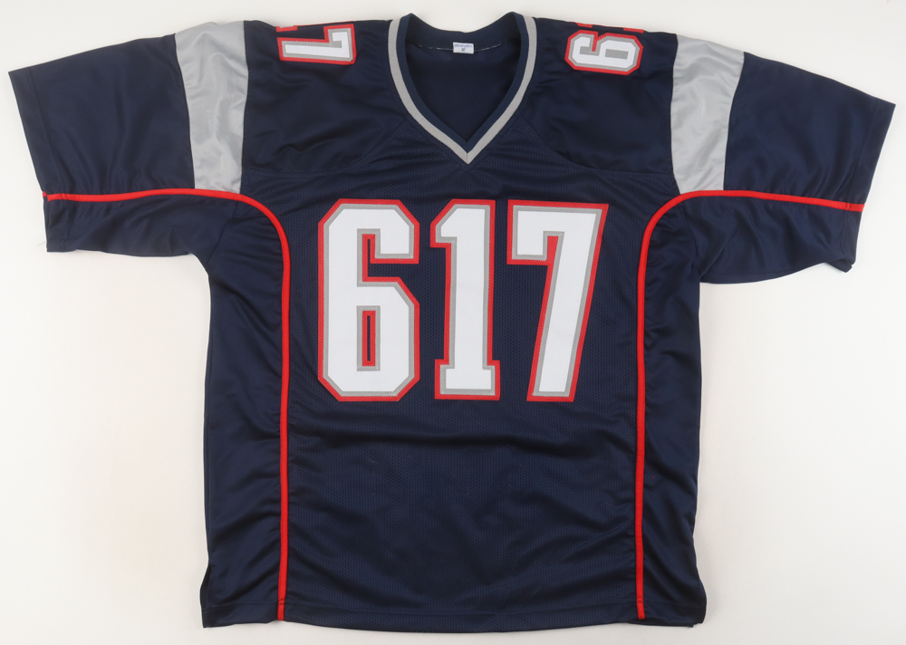 Custom jersey. Everything is sewn on, size XL. Hand-signed and inscribed by Joe Andruzzi.