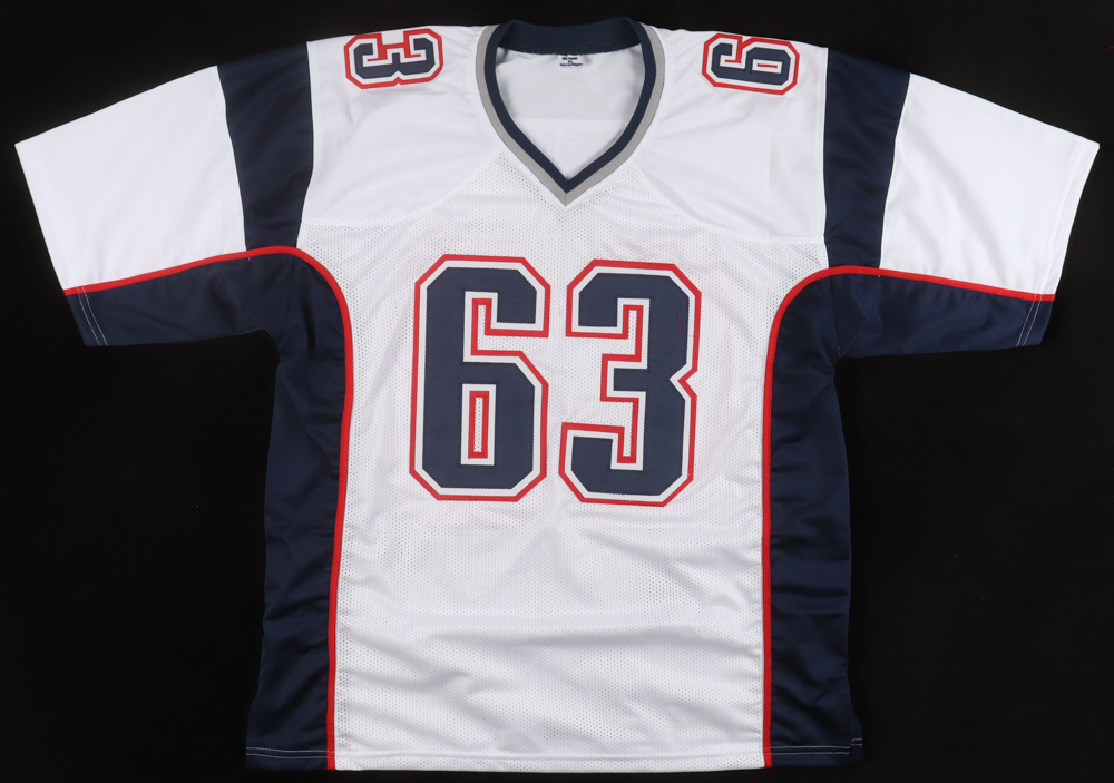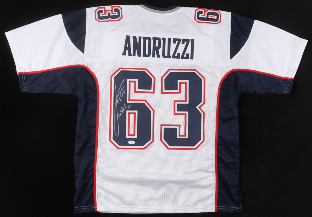 Custom jersey. Everything is sewn on, size XL. Hand-signed and inscribed by Joe Andruzzi.