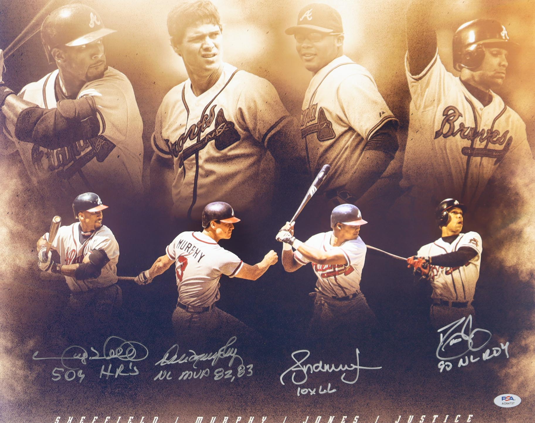 Dale Murphy, David Justice, Andrew Jones & Gary Sheffield Signed Braves 16x20 Photo With (4) Career Stat Inscriptions (PSA)
