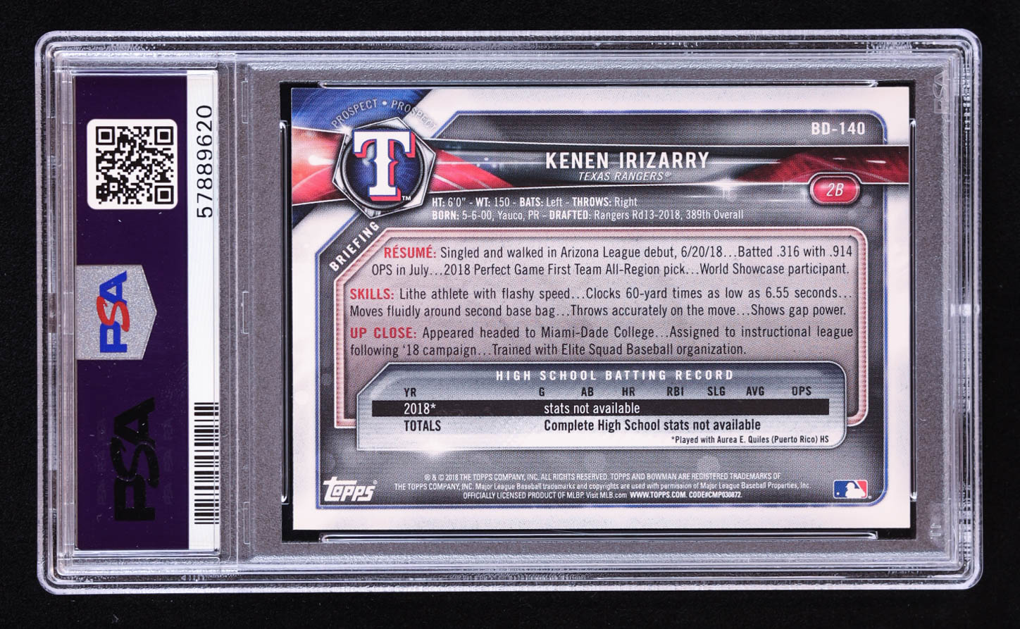 Kenen Irizarry Signed 2018 Bowman Draft #BD140 RC (PSA | Auto 10)