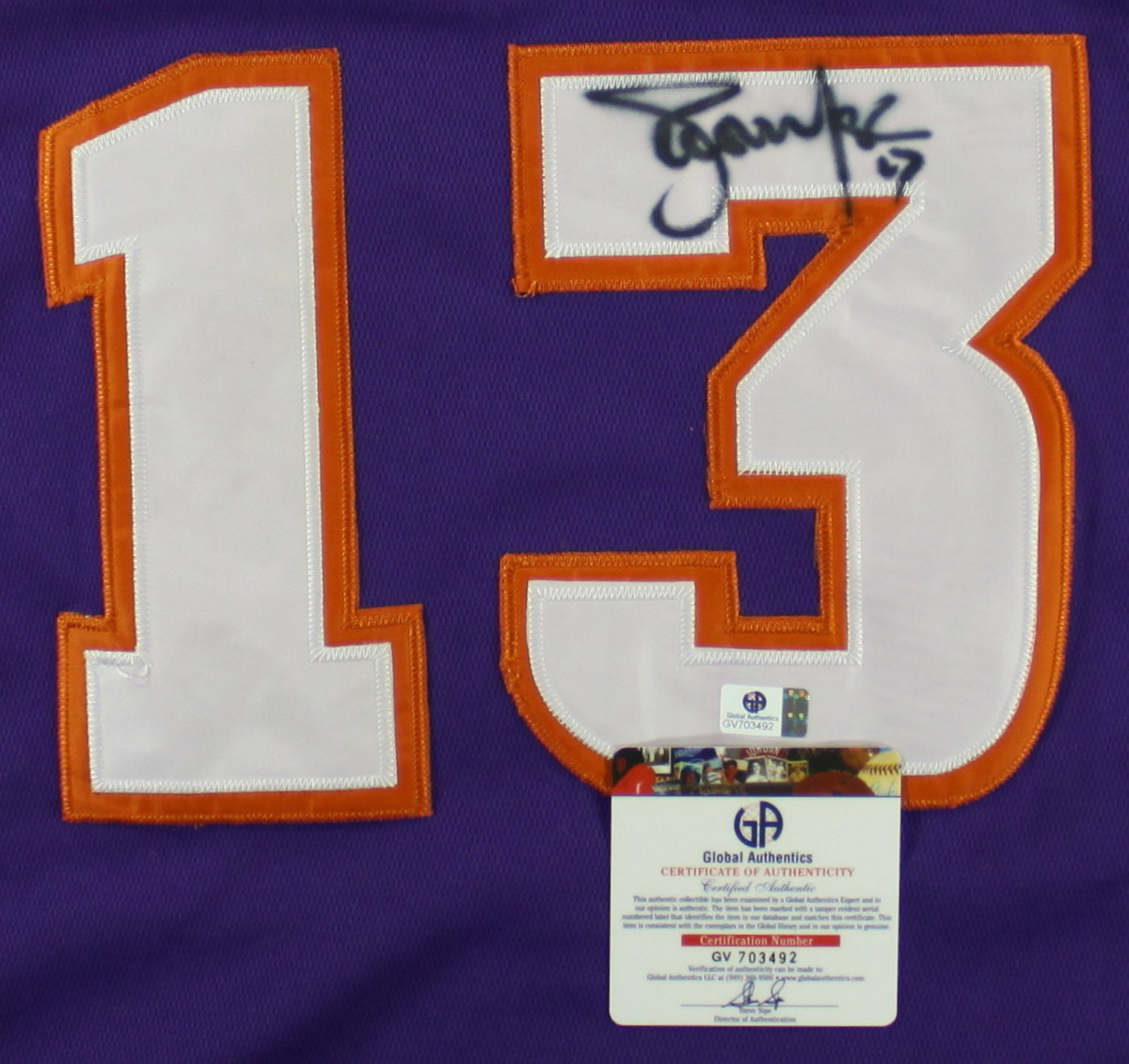 Adidas on-court style jersey. Everything is sewn on, size 48. Hand-signed in black felt tip pen. The autograph includes a Global Authentics (GA) hologram and matching COA for authenticity purposes.