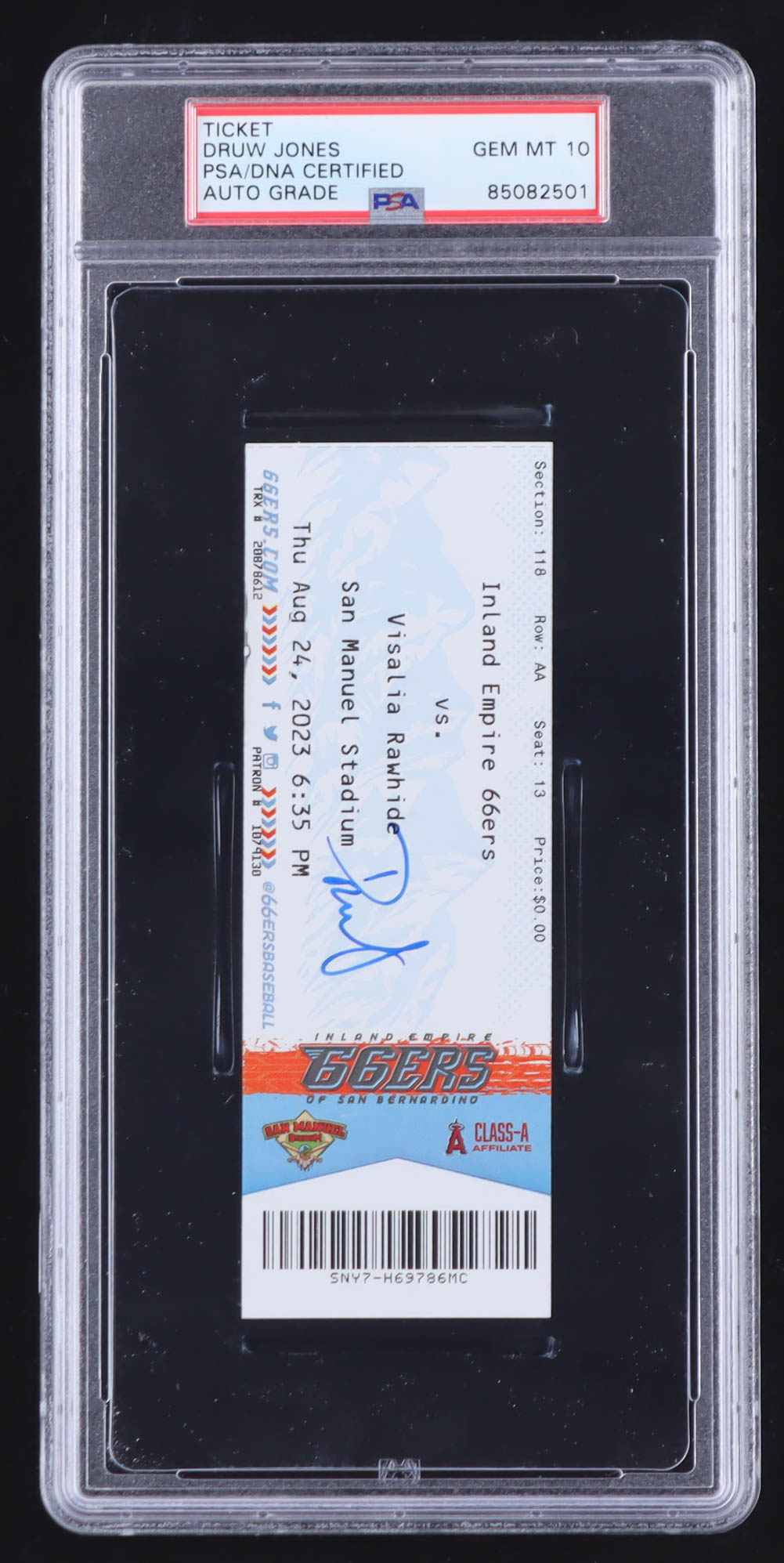 Druw Jones Signed 2023 Inland Empire 66ers vs. Visalia Rawhide Game Ticket (PSA | Auto Grade 10)