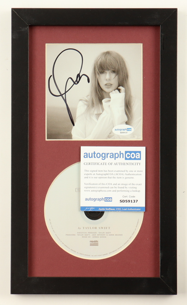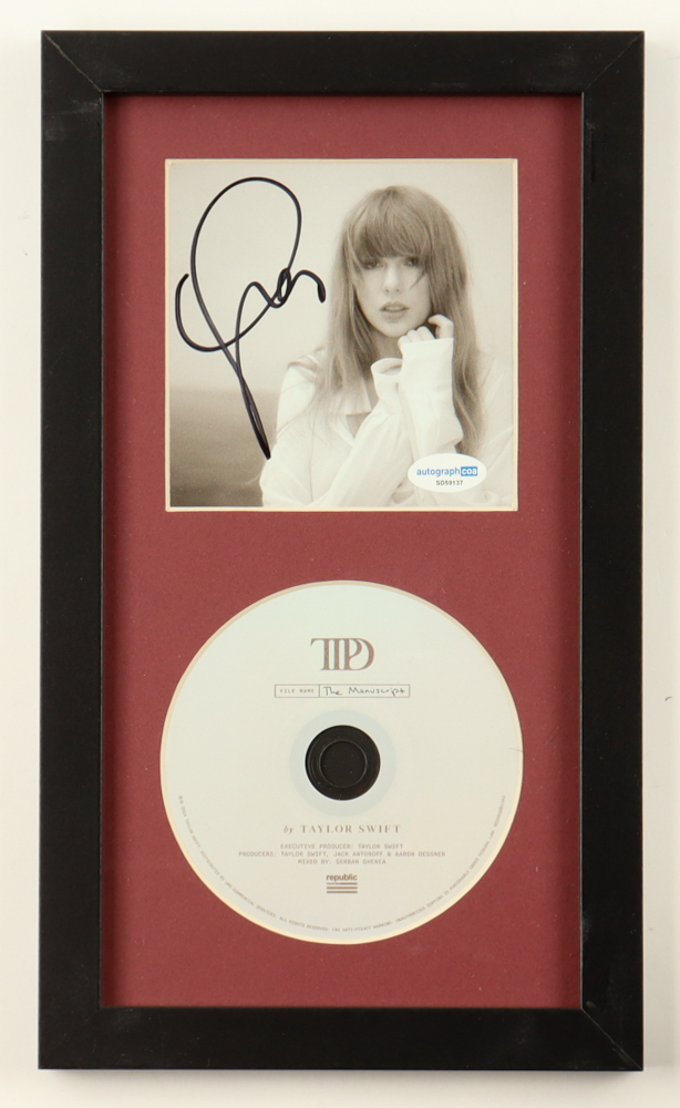 Custom frame measures approximately 8" x 13.5" in size. Features a "The Torture Poets Department" CD insert that has been hand-signed by Taylor Swift. The display also includes the disc as shown. Please note, there is scuffing on the frame.