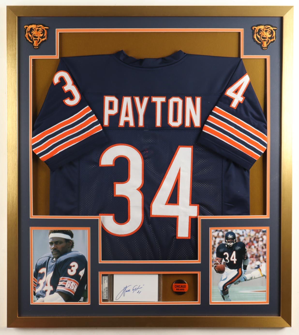 Walter Payton Signed Custom Framed Cut Display With Jersey, Vintage Bears Pin & (2) Cloth Logo Patches (PSA)