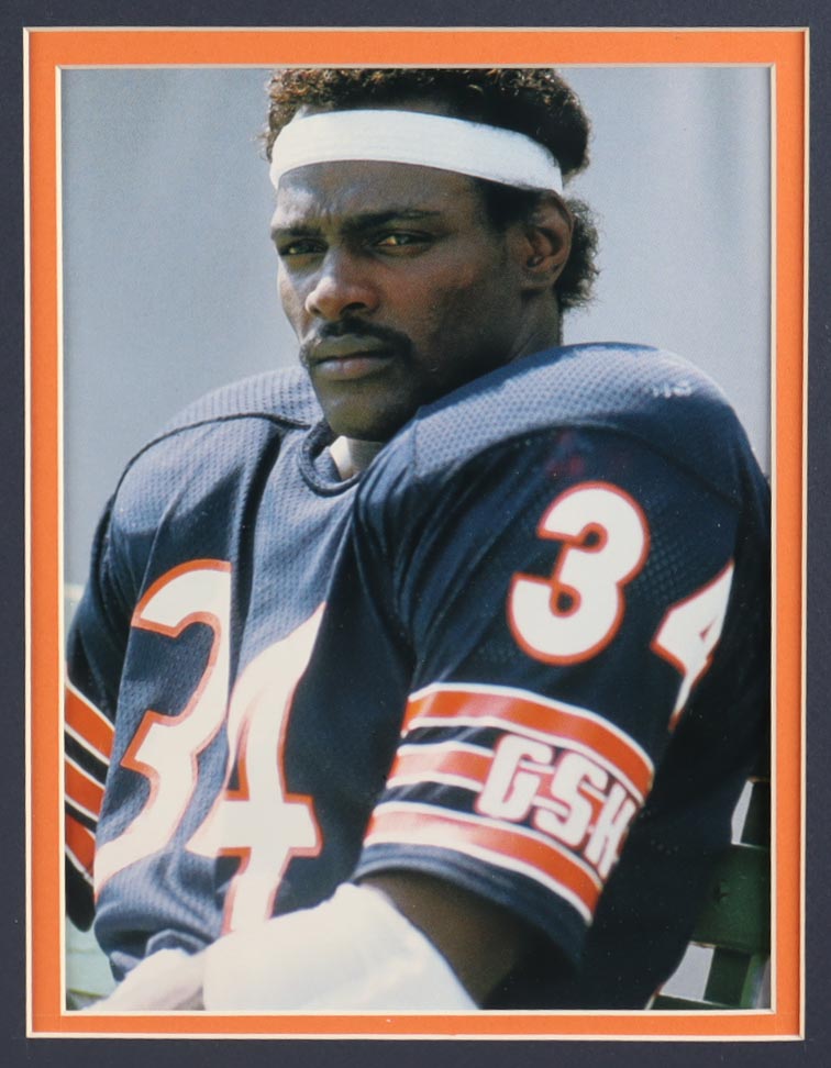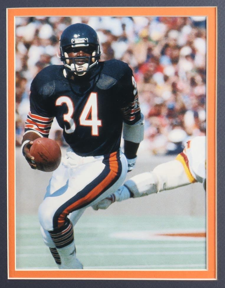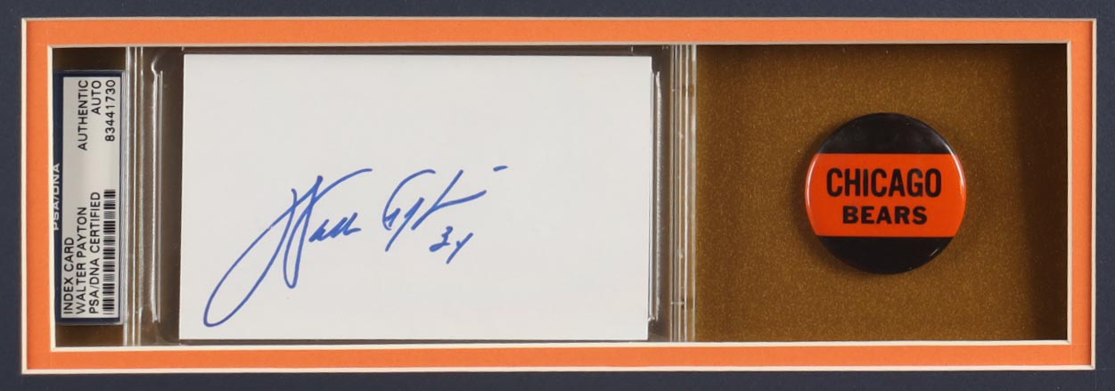 Custom frame measures approximately 32" x 36" in size and features a cut that has been hand-signed by Walter Payton (D. 1999, HOF). The display also includes a Super Bowl XX pin as well as (2) cloth team logo patches.