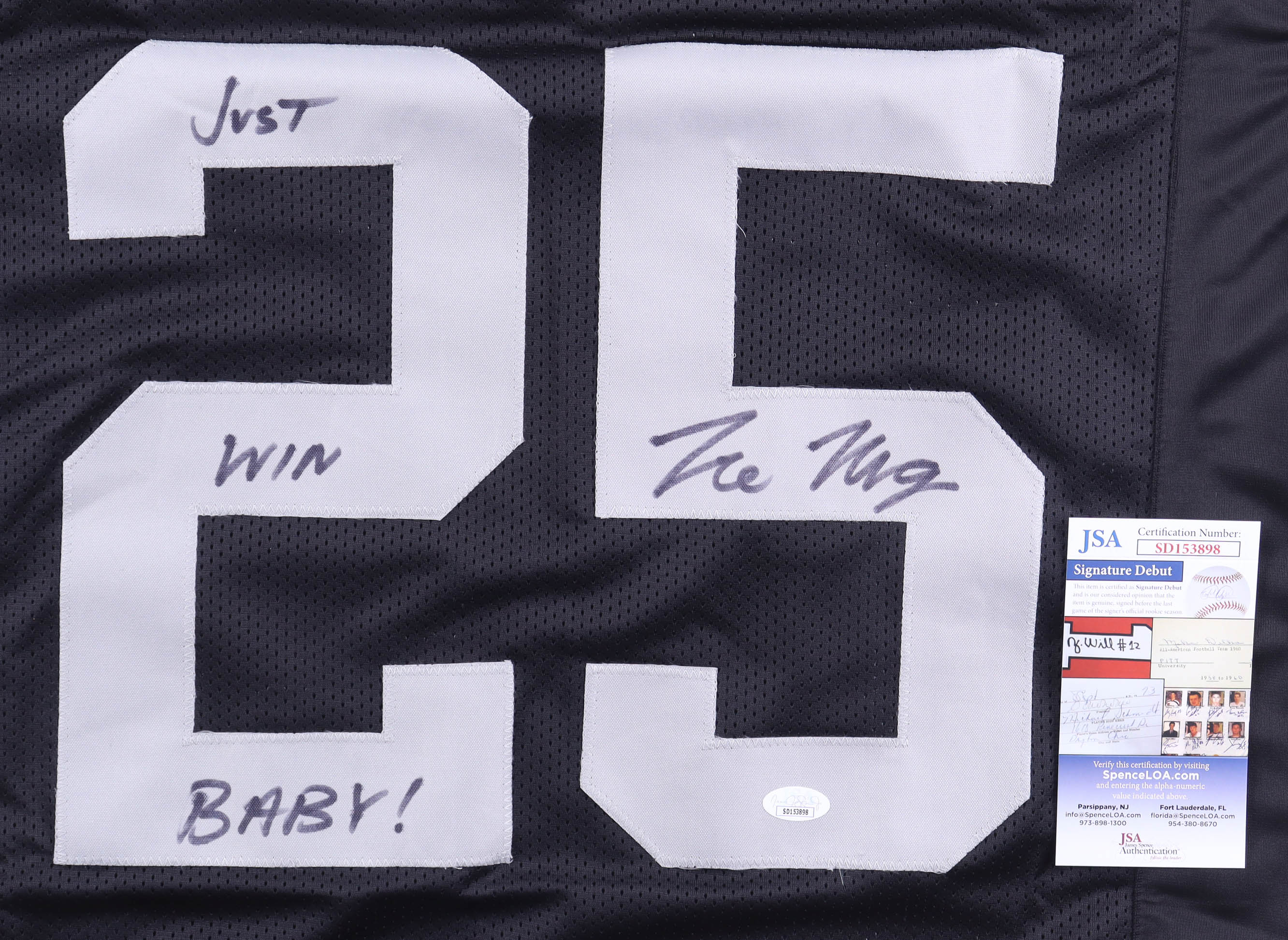 The autograph(s) includes an official James Spence Authentication (JSA) "Signature Debut" hologram. "Signature Debut" is the autographed memorabilia equivalent to a rookie card. The JSA definition of a "Signature Debut" is as follows: "Any item that is autographed and received by JSA prior to the last game of the signer's official rookie season.