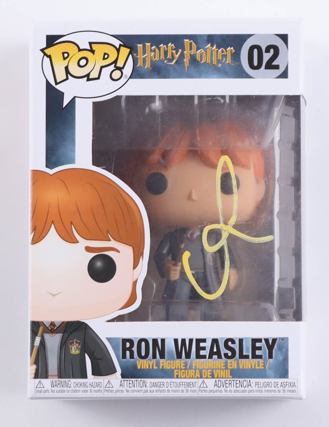 Vinyl figure measures approximately 4" tall and has been hand-signed on the packaging by Rupert Grint. Please note, the signature is scuffed.