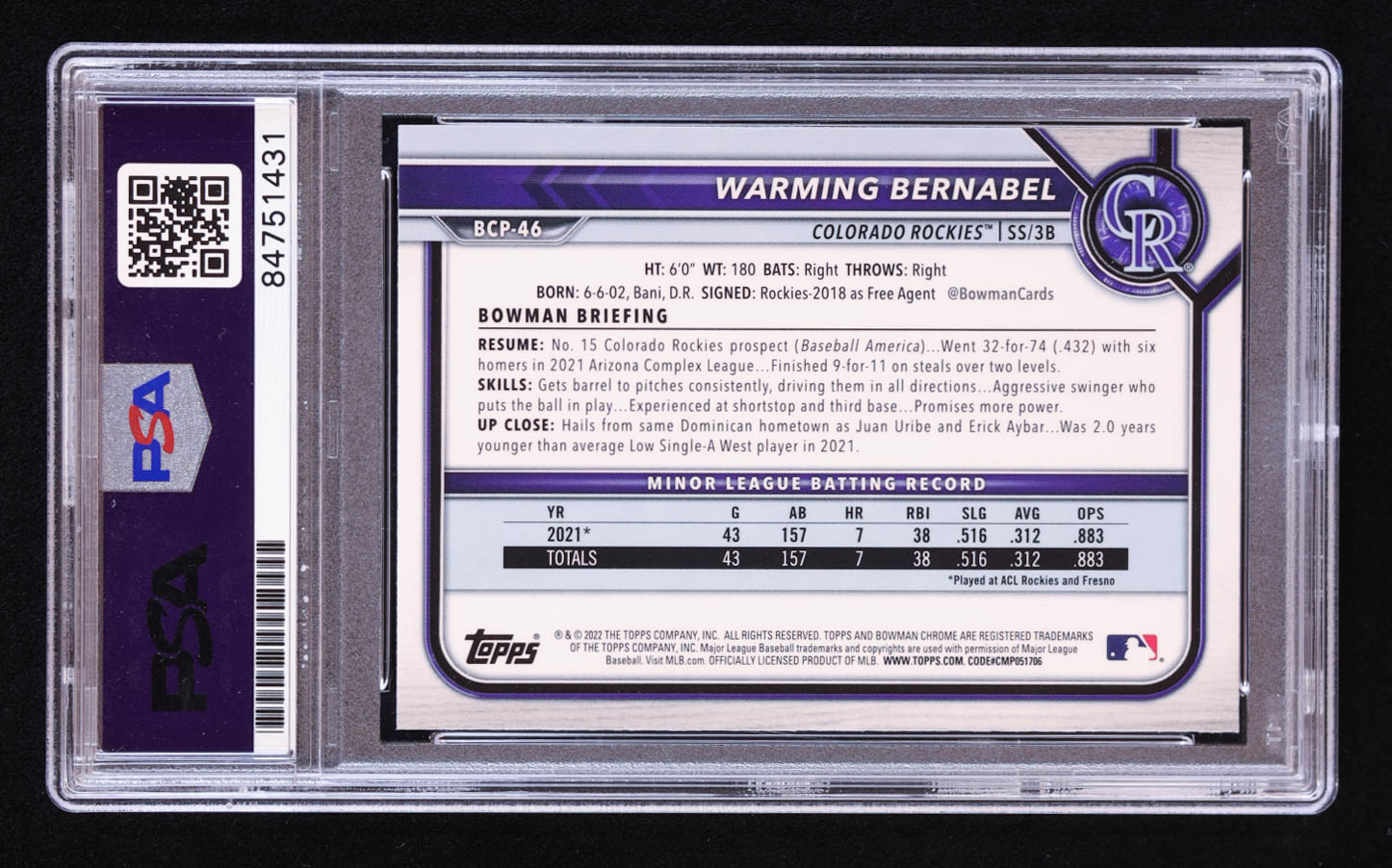 Warming Bernabel Signed 2022 Bowman Chrome Prospects #BCP46 RC (PSA | Auto 10)