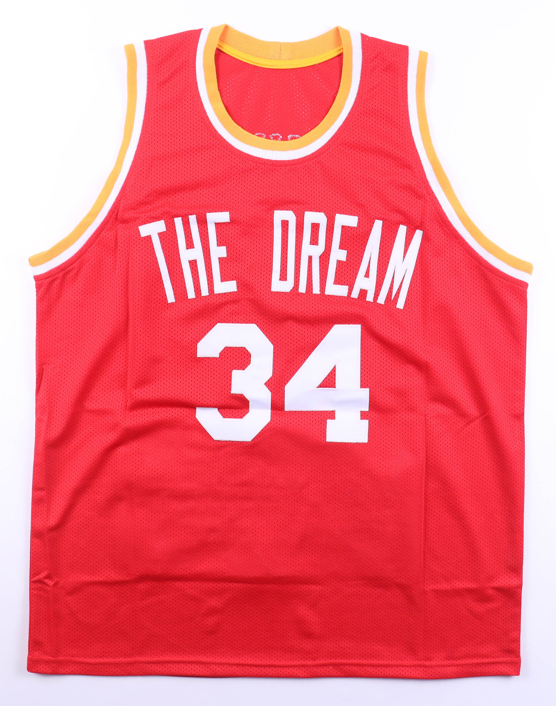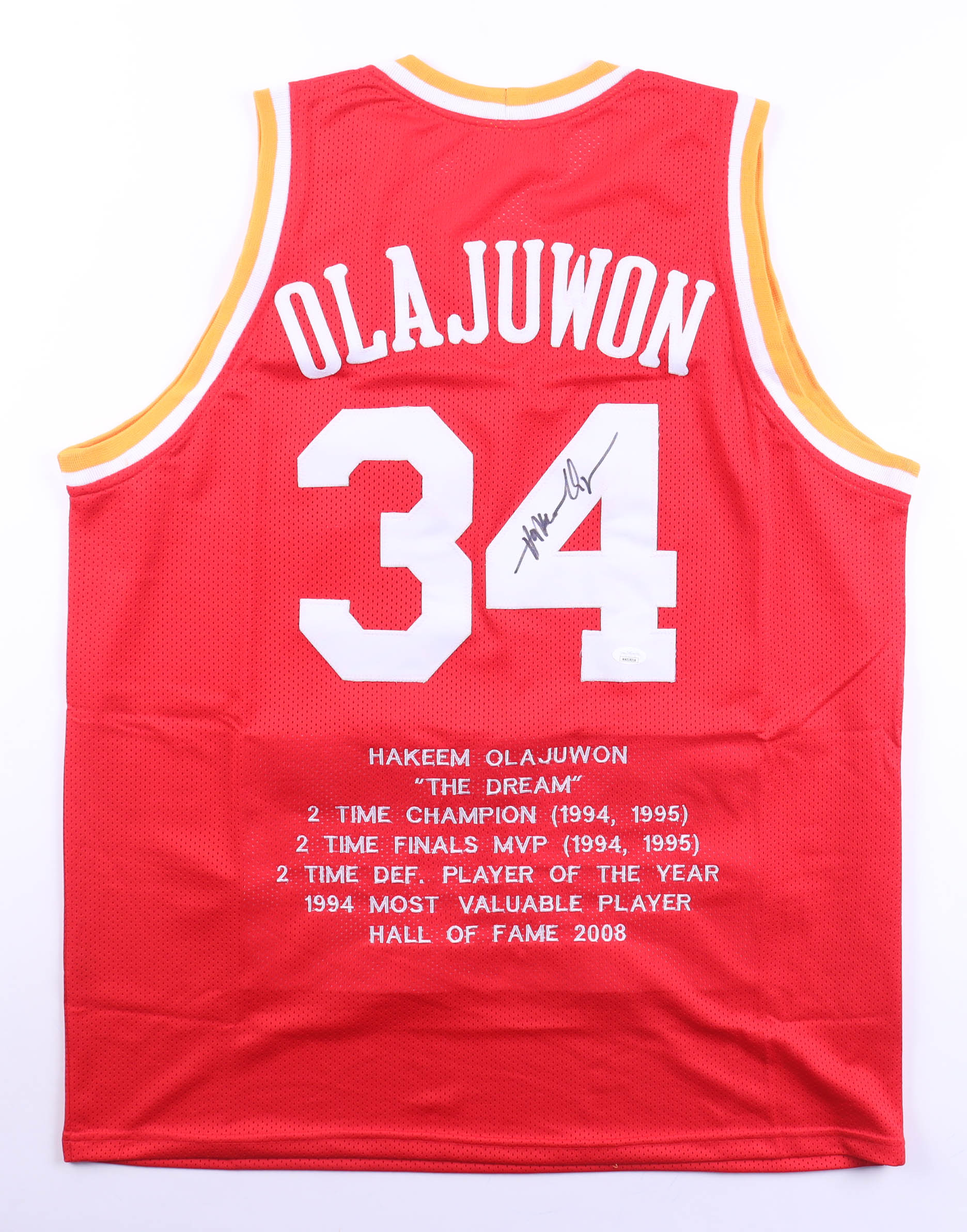 Custom jersey with everything sewn on, size XL. Hand-signed by Hakeem Olajuwon (HOF). Olajuwon's career highlights have been custom stitched onto the back of the jersey below the reverse number.