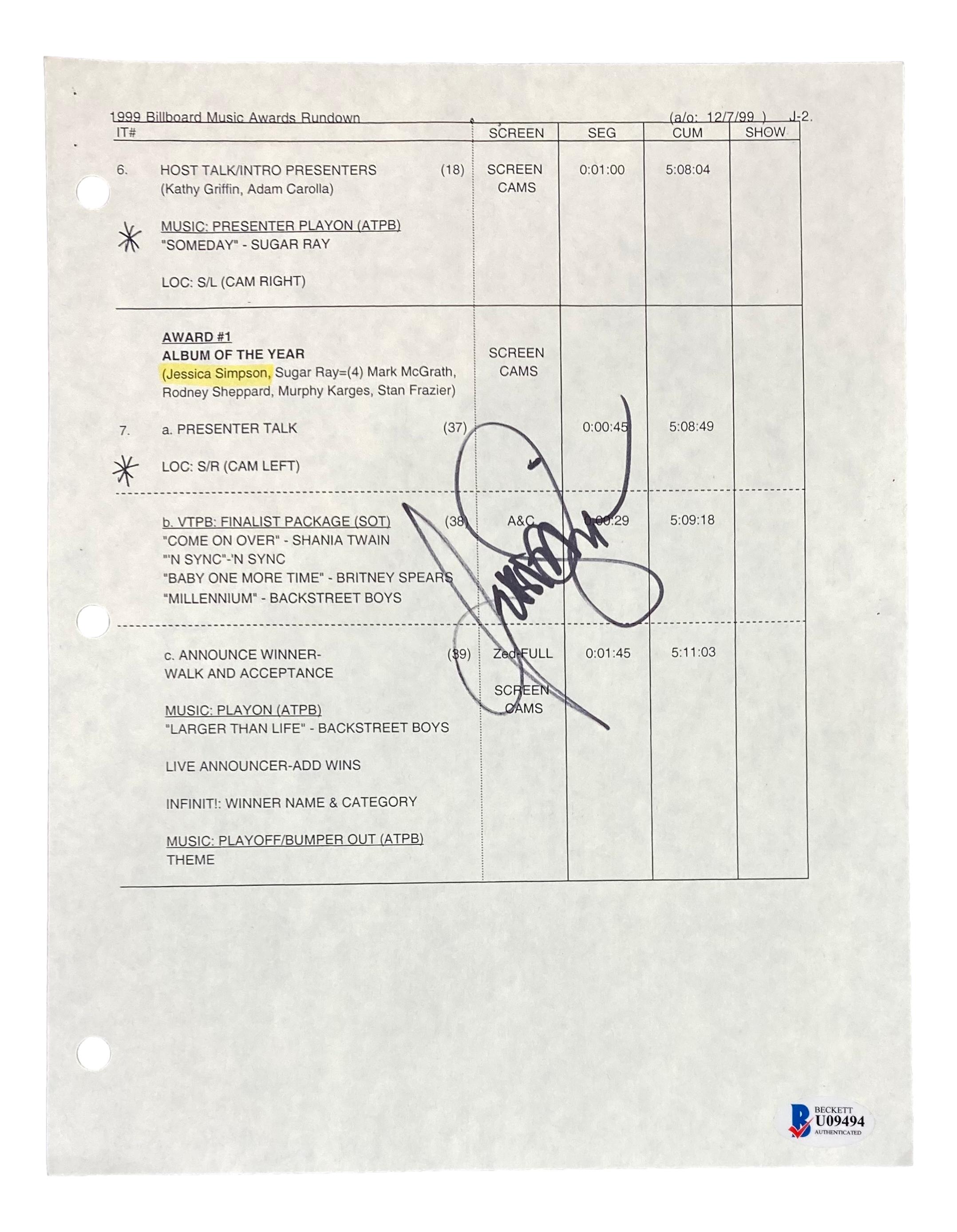 Jessica Simpson Signed 1999 Billboard Music Awards Document (Beckett)