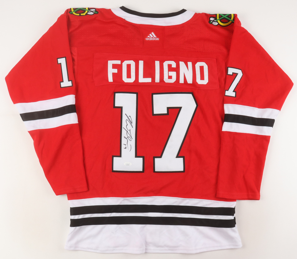 Adidas jersey. Everything sewn on, size 52. Hand-signed by Nick Foligno. Please note, there is staining on the reverse number.