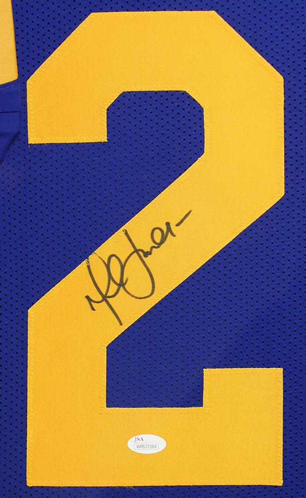 Custom frame measures 35” x 43” in size and features a jersey that has been hand-signed by Marshall Faulk (HOF).