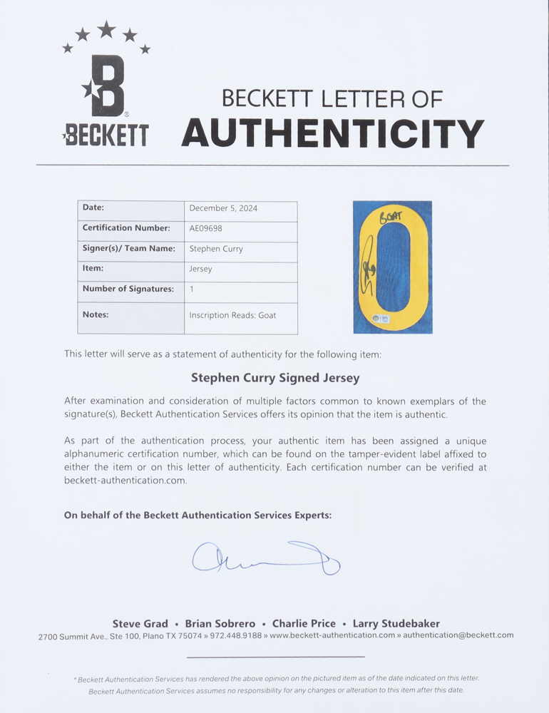 The lot / autograph(s) includes an official USA Sports Marketing Stephen Curry hologram as well as an official Beckett Authentication Services hologram and matching LOA for authenticity purposes.