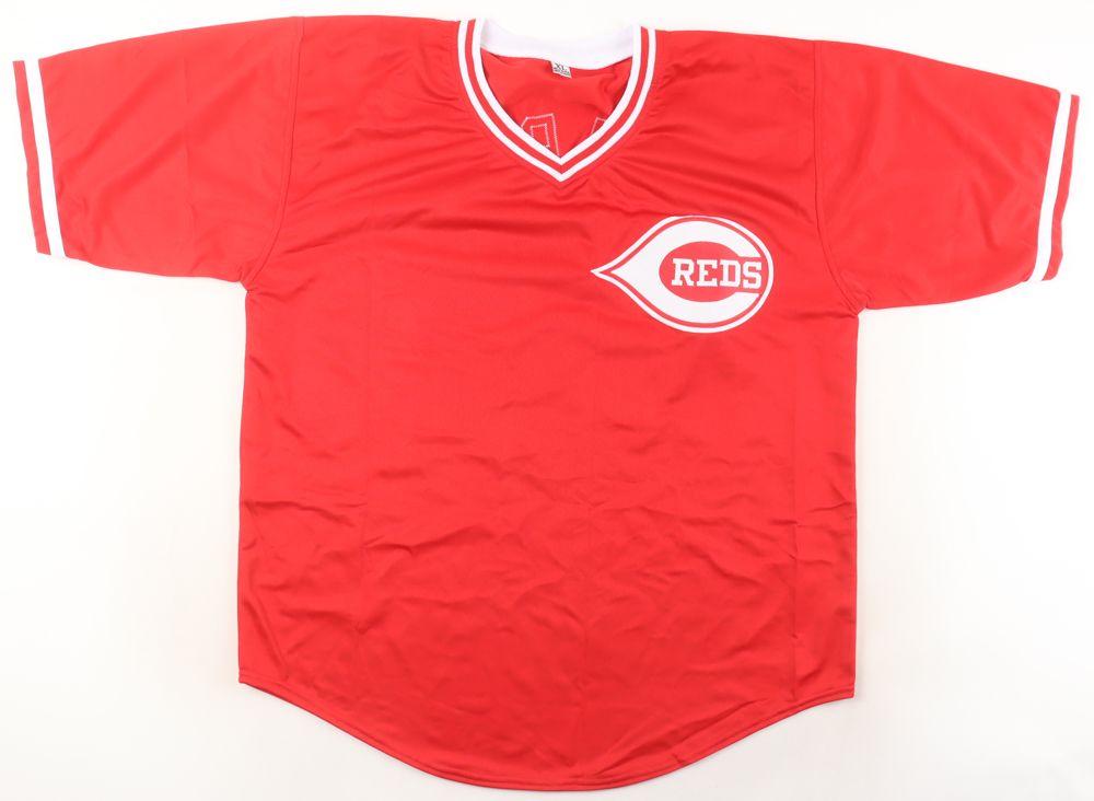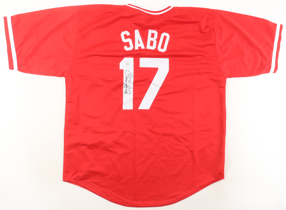 Custom jersey with everything sewn on, size XL. Hand signed by Chris Sabo.