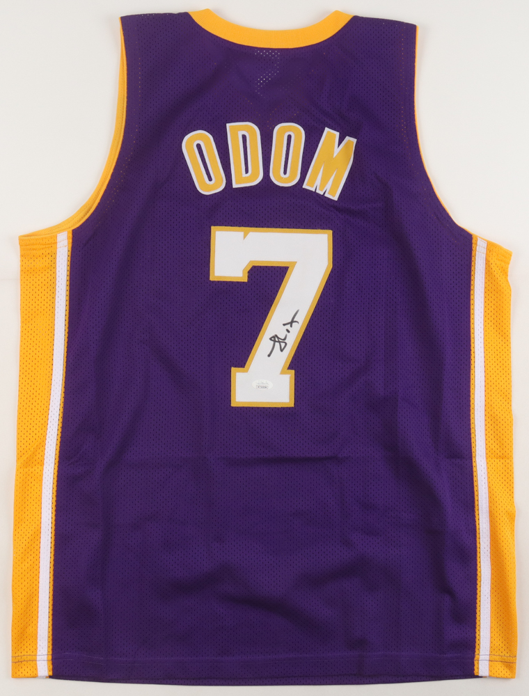 Custom jersey with everything sewn on, size L. Hand-signed by Lamar Odom.