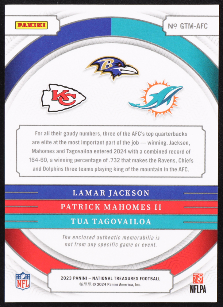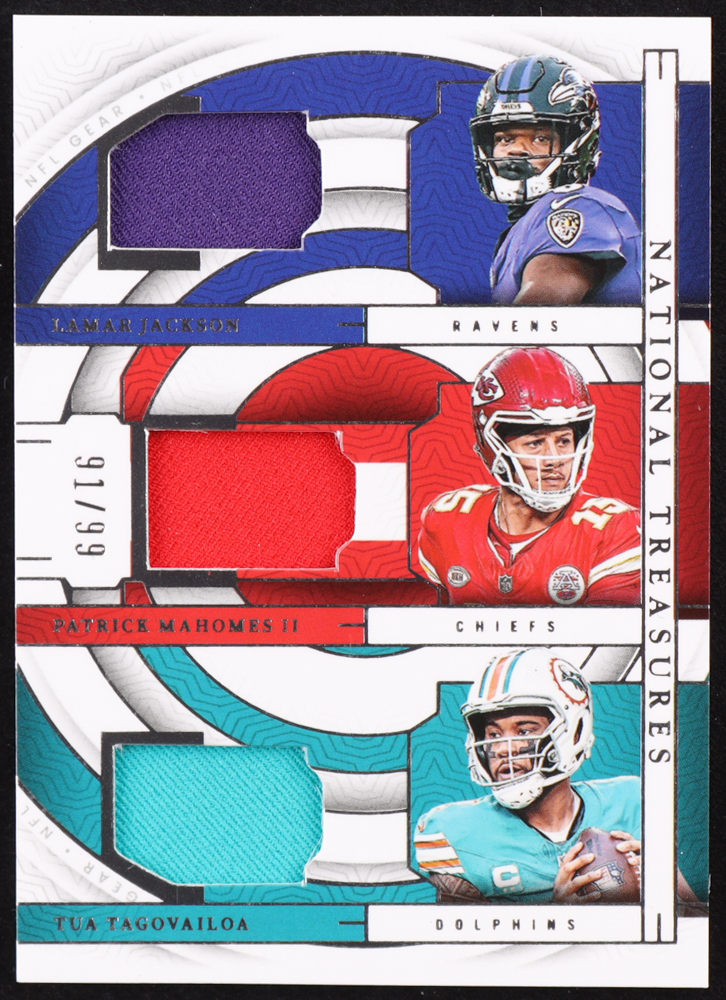 Lamar Jackson / Patrick Mahomes II / Tua Tagovailoa 2023 Panini National Treasures NFL Gear Trio Materials #19 #91/99