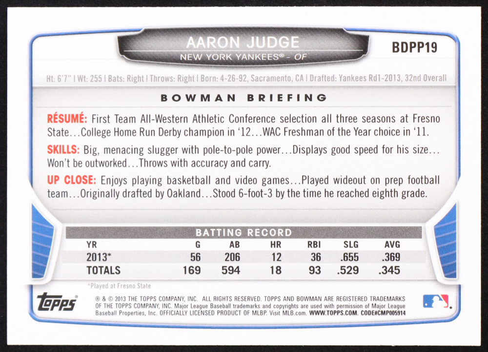 Aaron Judge 2013 Bowman Draft Draft Picks #BDPP19 RC