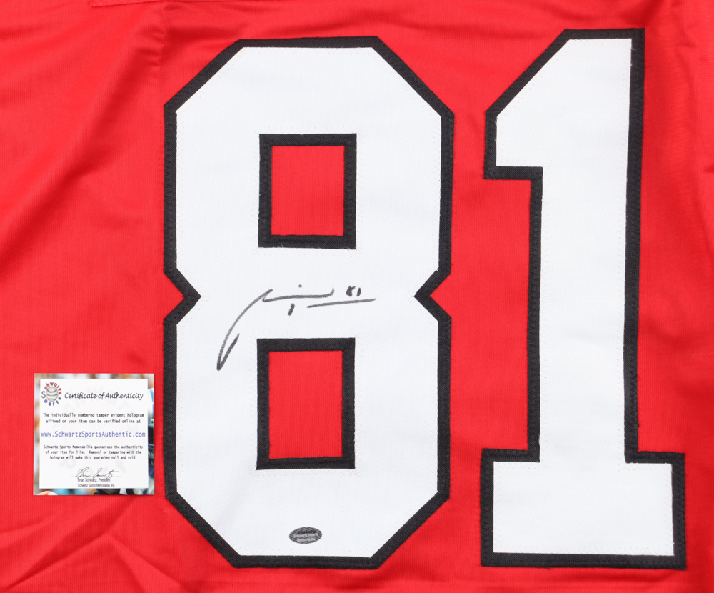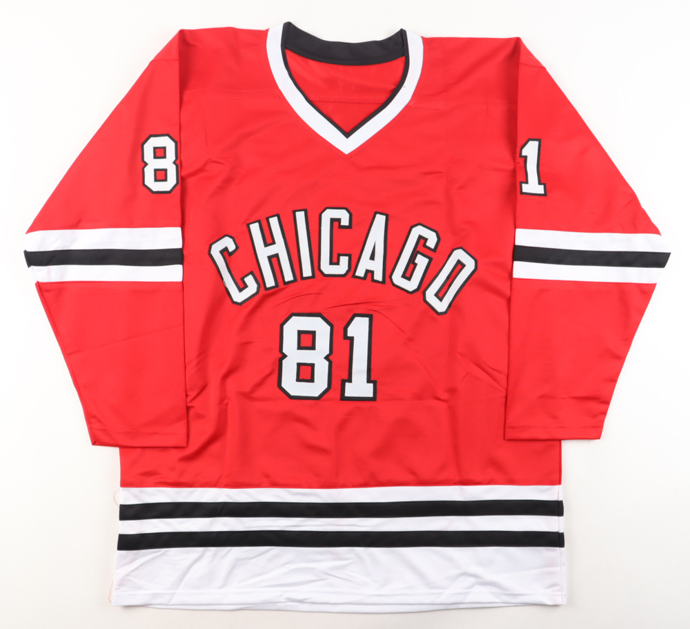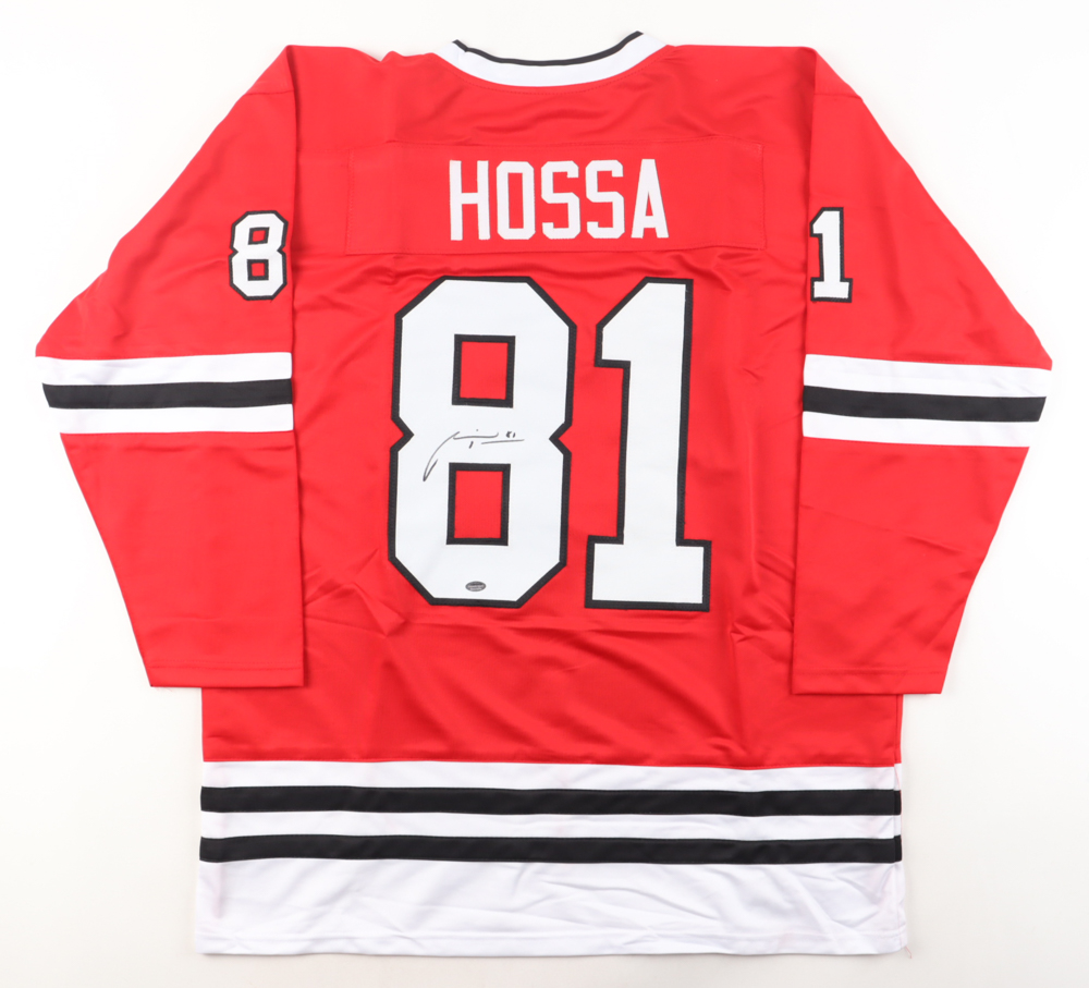 Custom jersey. Everything is sewn on. Size XL. Hand-signed by Marian Hossa (HOF).