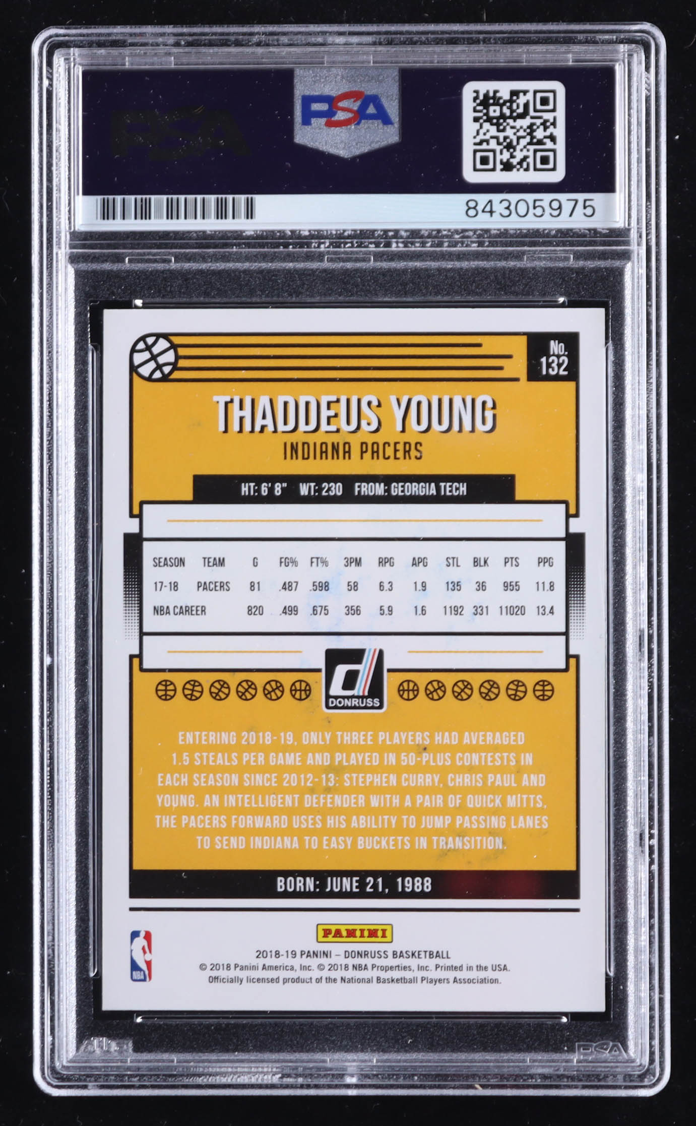 Thaddeus Young Signed 2018-19 Donruss #132 (PSA)