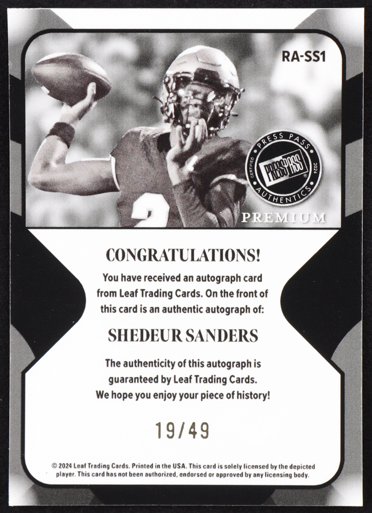 Shedeur Sanders 2024 Press Pass Premium Retro Autographs #RASS1 RC #19/49