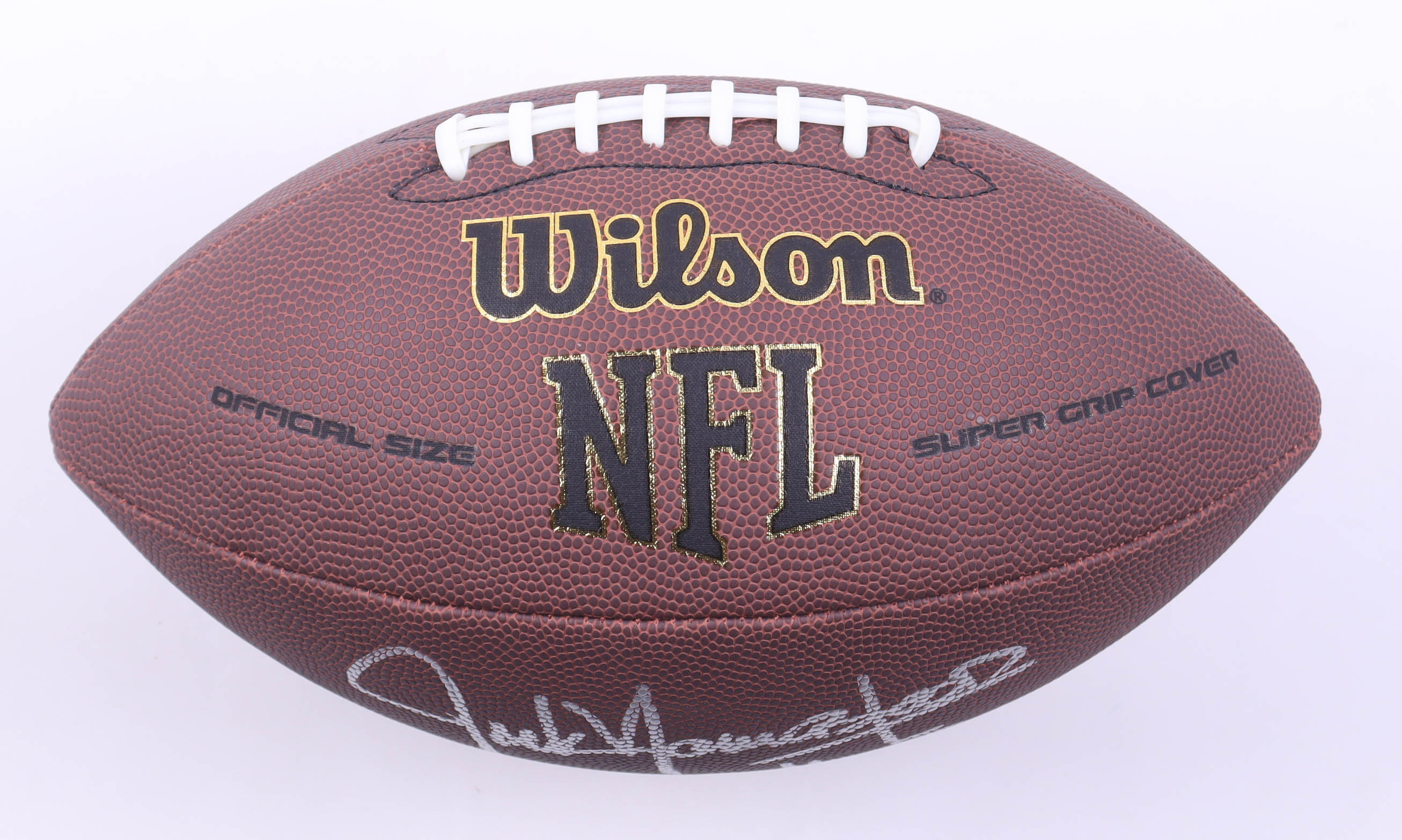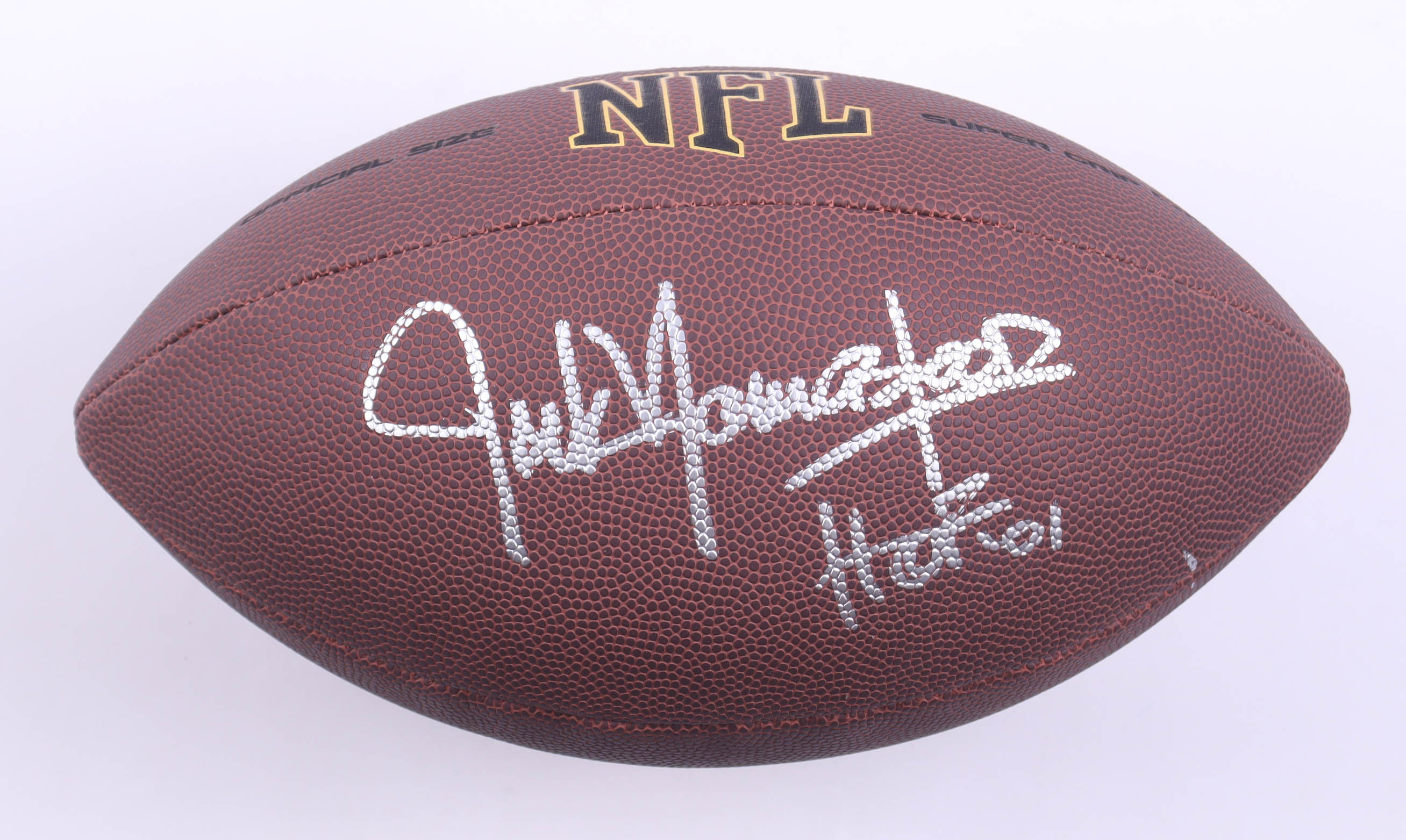 Wilson Super Grip NFL Football. Hand-signed and inscribed by Jack Youngblood (Los Angeles Rams, HOF). Please note, the signature has been smudged and there are stains throughout the football.