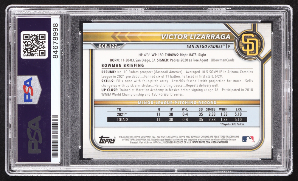 Victor Lizarraga Signed 2022 Bowman Chrome Prospects #BCP127 RC (PSA | Auto 10)