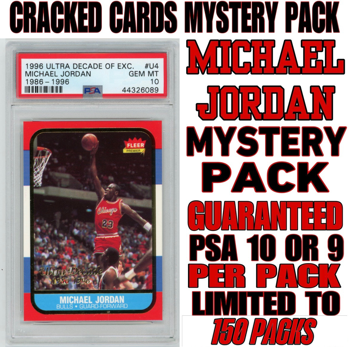 Cracked Cards presents Michael Jordan PSA Mystery Box Edition #4. Only 150 boxes are available and each is auctioned off at Pristine Auction. Each box contains (1) Slabbed & Graded Michael Jordan Card graded by PSA a grade of 10 or 9. One box will contain the 1996 Fleer Decade Of Excellence Michael Jordan #4 PSA 10.