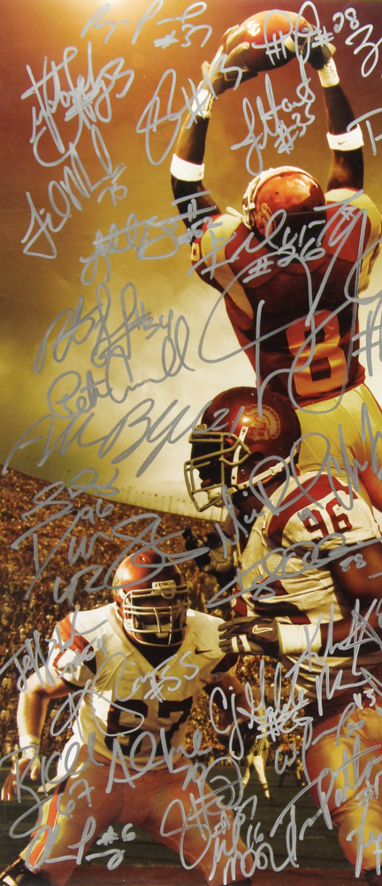 Poster measures 17" x 22" and has been hand signed in silver paint pen by (54) members of the USC Trojans including Dwayne Jarrett, Sam Baker, Chris McFoy, Shareece Wright, Ryan Kalil, Allen Bradford, Lawrence Jackson, Ryan Powdrell, C.J. Gable, Fili Moala, Stafon Johnson, Terrell Thomas, John David Booty, Keith Rivers, Rey Maualuga, Patrick Turner and (39) others.