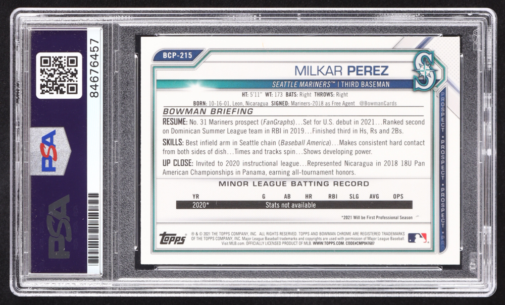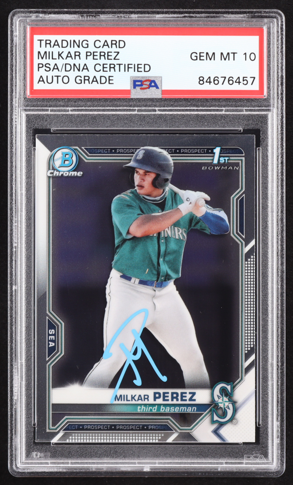 Milkar Perez Signed 2021 Bowman Chrome Prospects #BCP215 RC (PSA | Auto 10)
