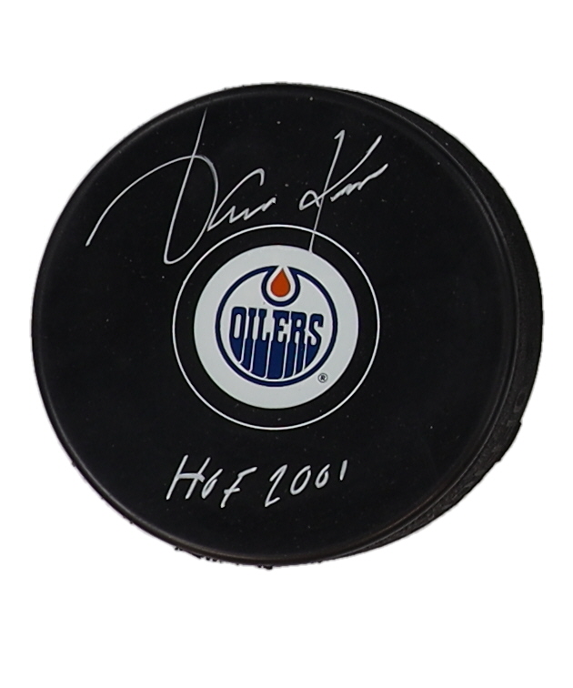 Edmonton Oilers Logo Hockey Puck. Hand-signed and inscribed by Jari Kurri (HOF).