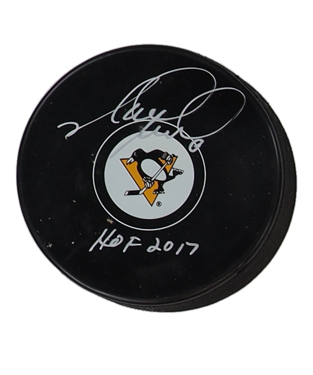 Pittsburgh Penguins Logo Hockey Puck. Hand-signed and inscribed by Mark Recchi (HOF).