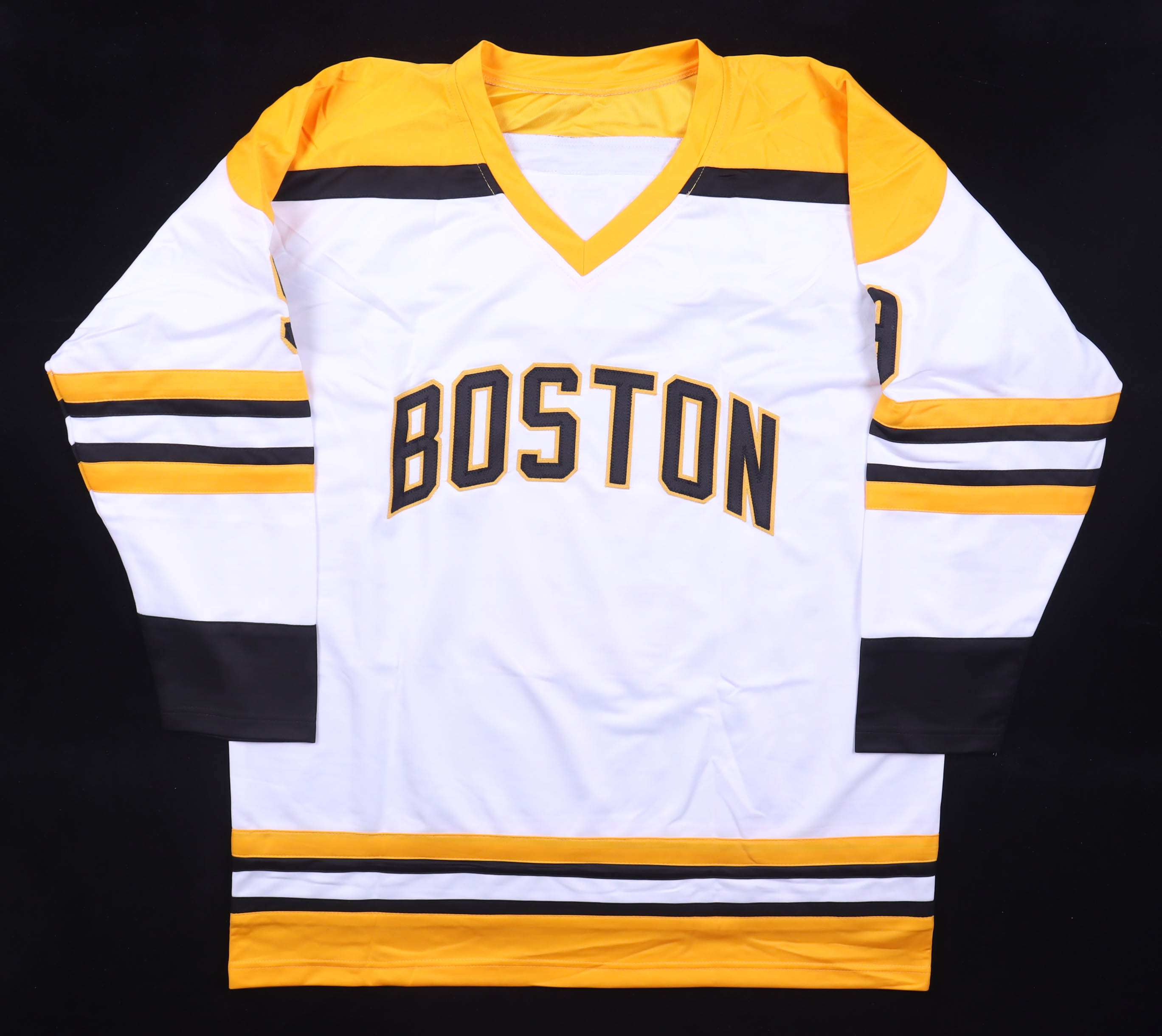Custom jersey. Everything is sewn on, size XL, and has been hand-signed and inscribed by Johnny Bucyk (HOF).