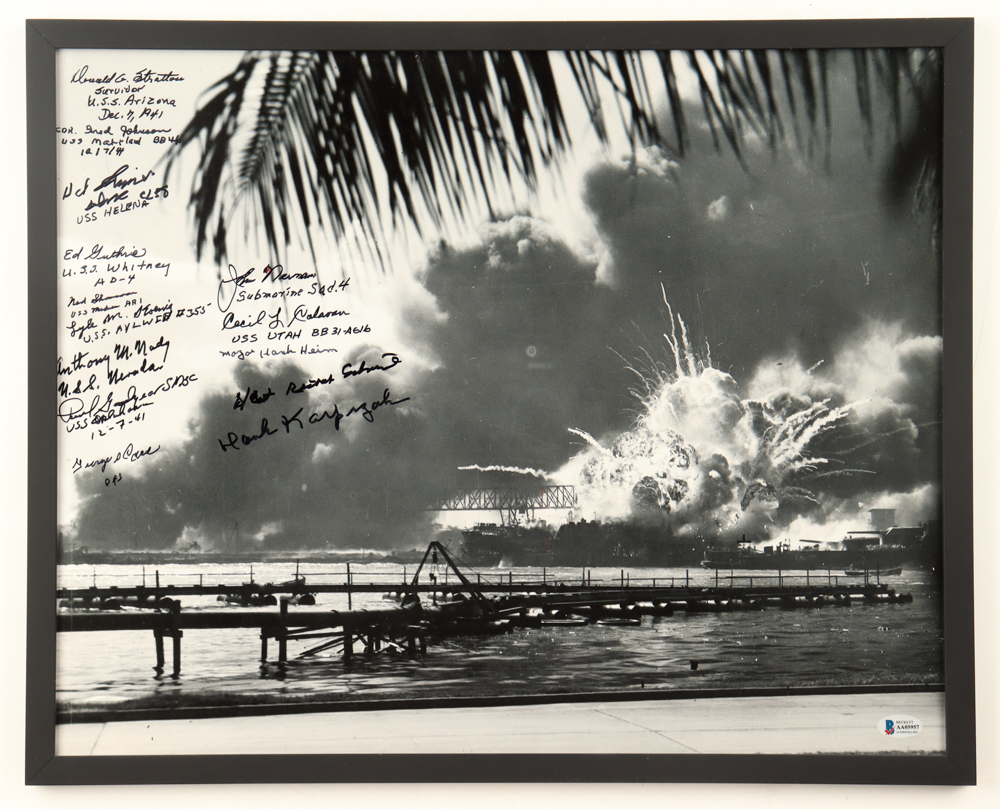 Pearl Harbor Survivors Custom Framed Photo Signed By (14) With Henry Heim, Fred Johnson, George Drake, Donald Stratton (Beckett)